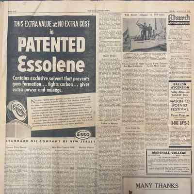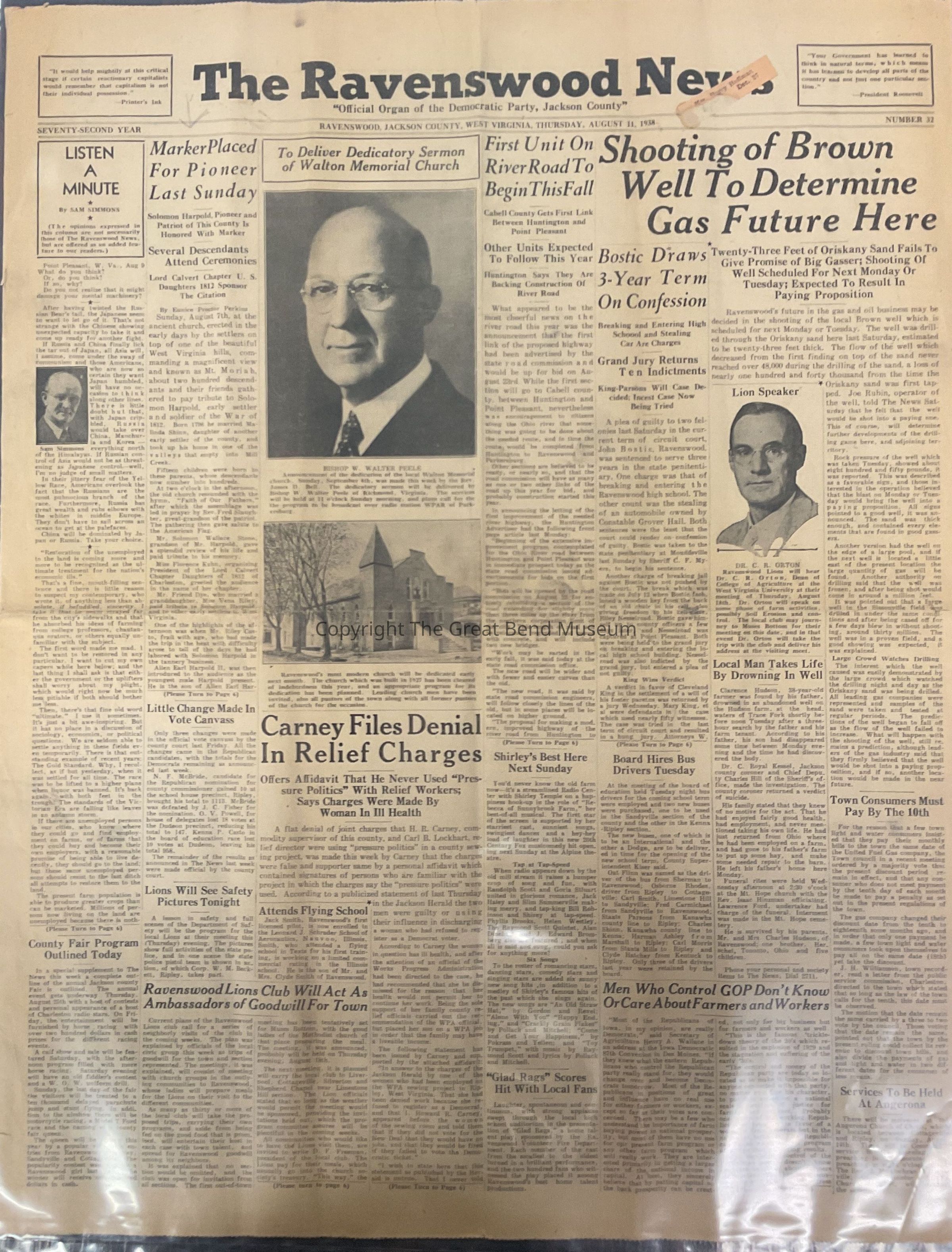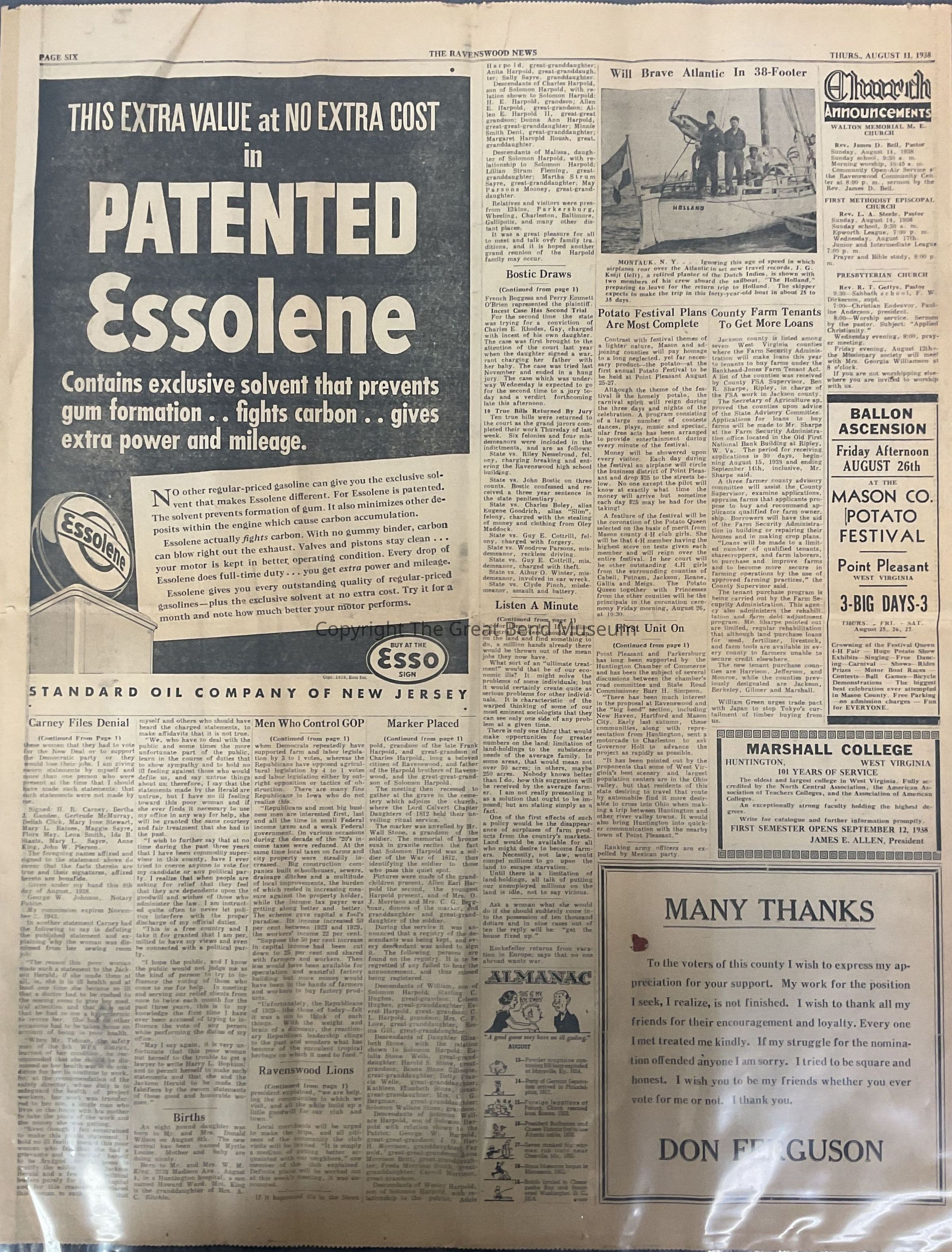 72 year, No. 32, 4 pages - D.F. Freeman, Editor; Published Tuesdays and Thursdays; 1 year - $1.50, 6 months - $1.00. Has sticker at the top right side "Mrs. Harry Hoffman. Dec 37" (not sure what the sticker was for.) Front page articles: Marker placed for pioneer and patriot Solomon Harpold. Bishop W. Walter Peele to deliver dedication of Walton Memorial Church. First unit on River Road between Huntington and Point Pleasant to begin in the fall. Various other articles Page 2 - short articles regarding politics and other subjects.
