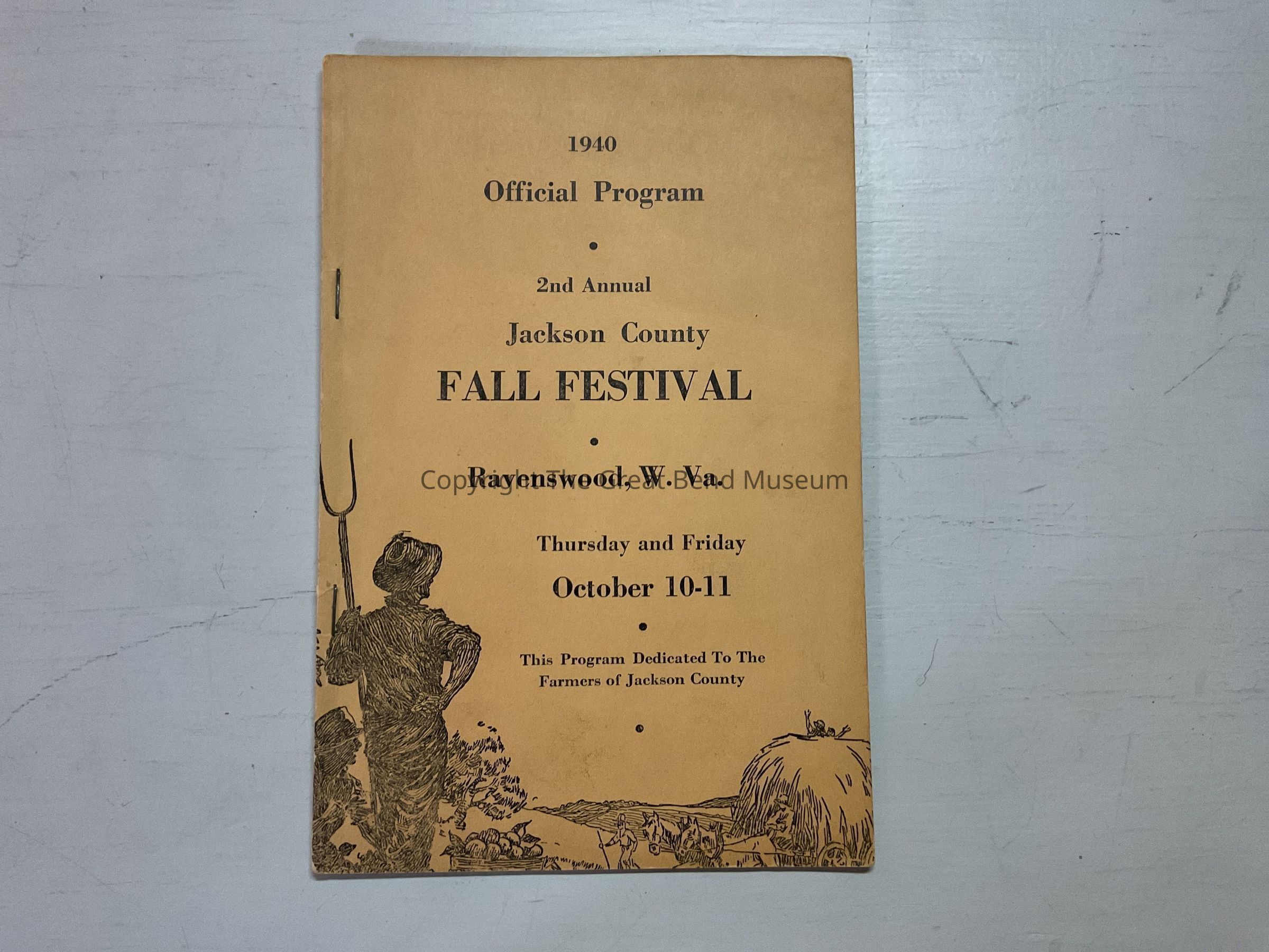 Booklet with schedule and lists of events and entertainment with advertisements from businesses across Jackson Co. It was second annual fall festival held in Ravenswood. Has a ink drawing of a farmer holding a pitchfork look over a hayfield.