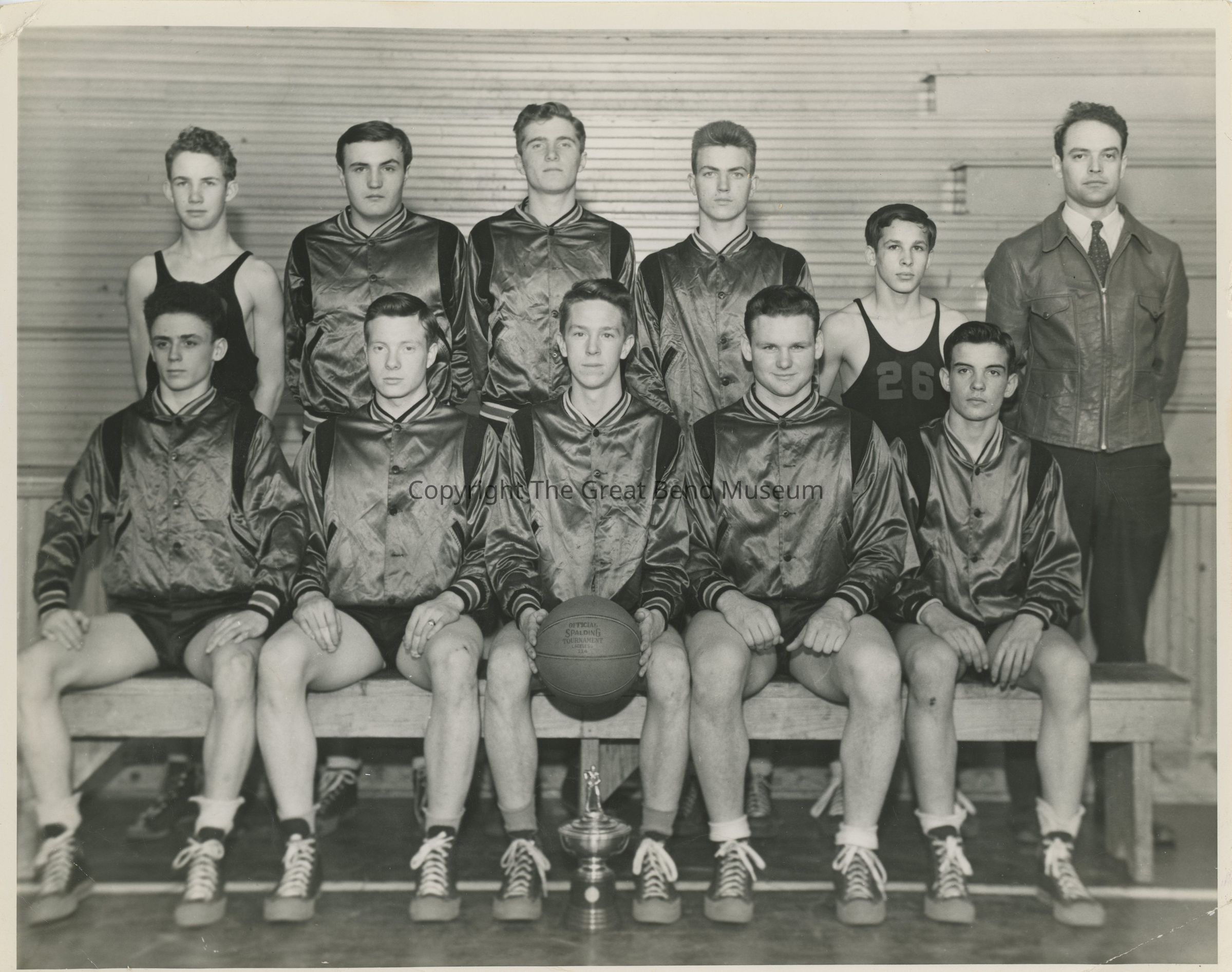 Picture of 1948 RHS Basketball Team - 10 players, 1 coach, trophy in picture, written in ink on the back - Ravenswood Basketball Team 1948 Lewis C. Rardin. Photo by Paul R. Moore Ravenswood W.Va. - Stamped