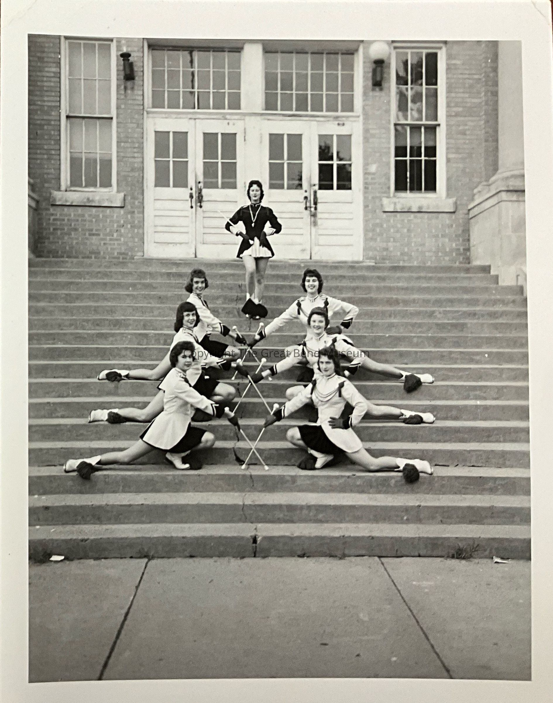 “Jigger” McGraw (Head Majorette) Then far left row is Carol Hartley, Dee Ann Moore, and Mary Caldwell. The right row is Kay Hudkins Rebecca Blackburn, and Eileen Bolinger.Acquisition