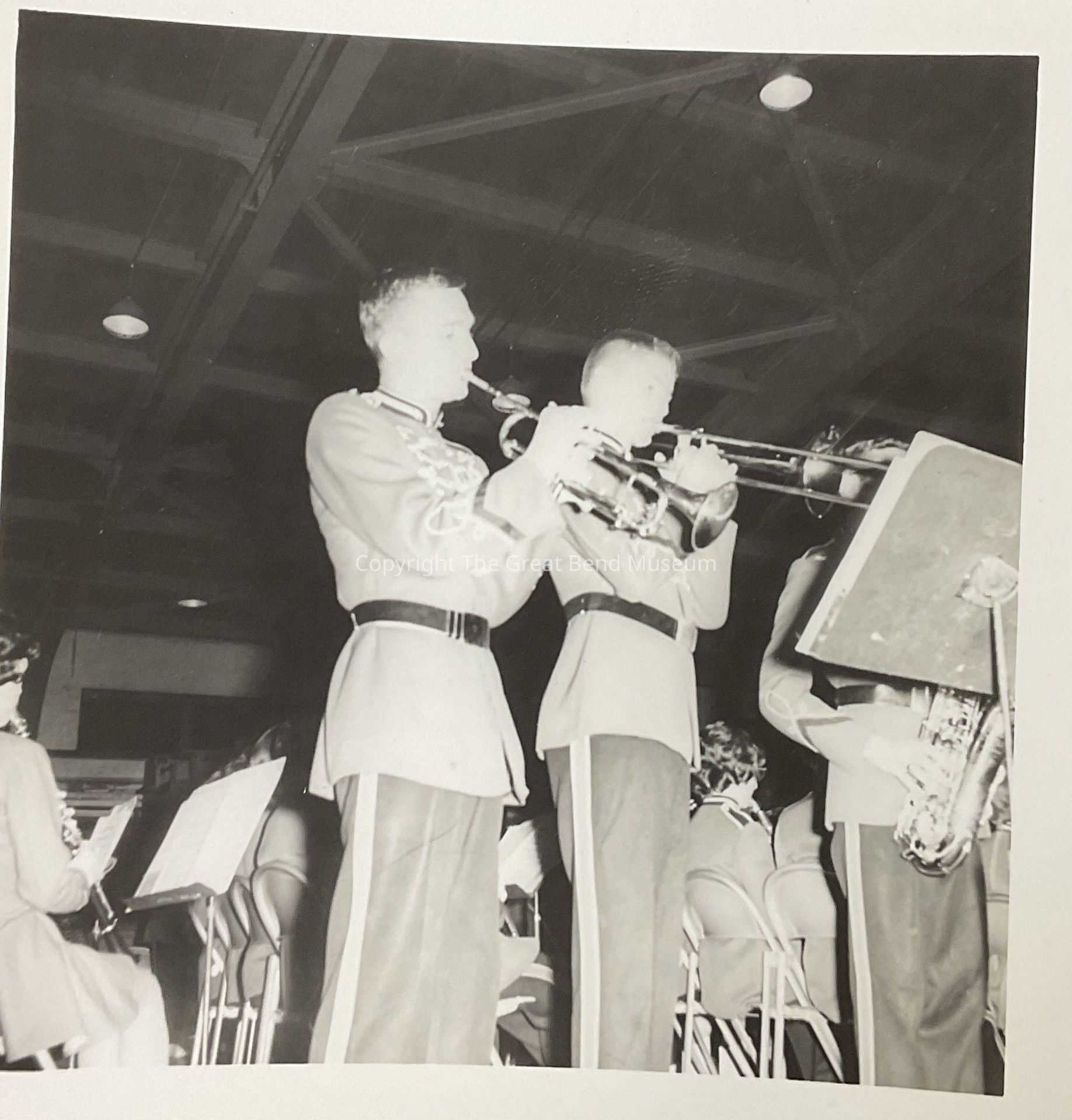 Two men standing beside one another playing instruments at the 1964 RHS spring band concert.