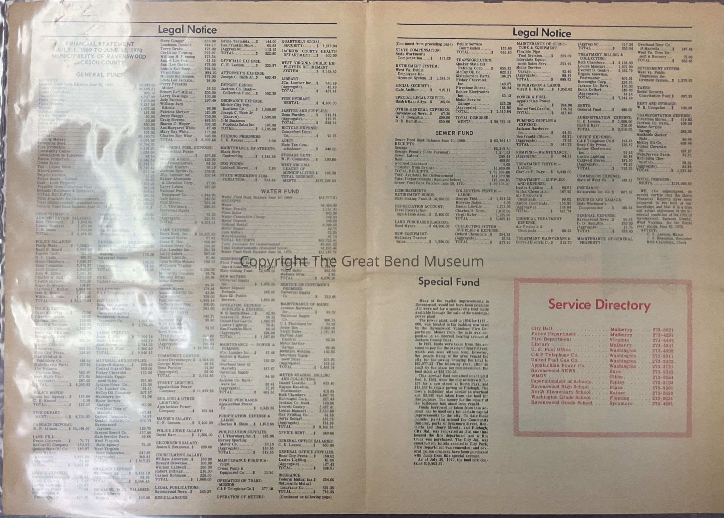 City of Ravenswood Annual Report 1969-1970: Open Letter from Mayor CE Leeson; Pictures of Mayor, Office Personnel, City Council members; Legal Notices; Pictures; Police Department, Planning Commission, Fire Department, City Maintenance; Recreation Pictures - pools, river, snow sled, city park, the riverfront park, water reservoir.