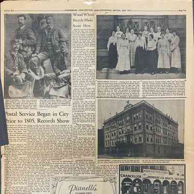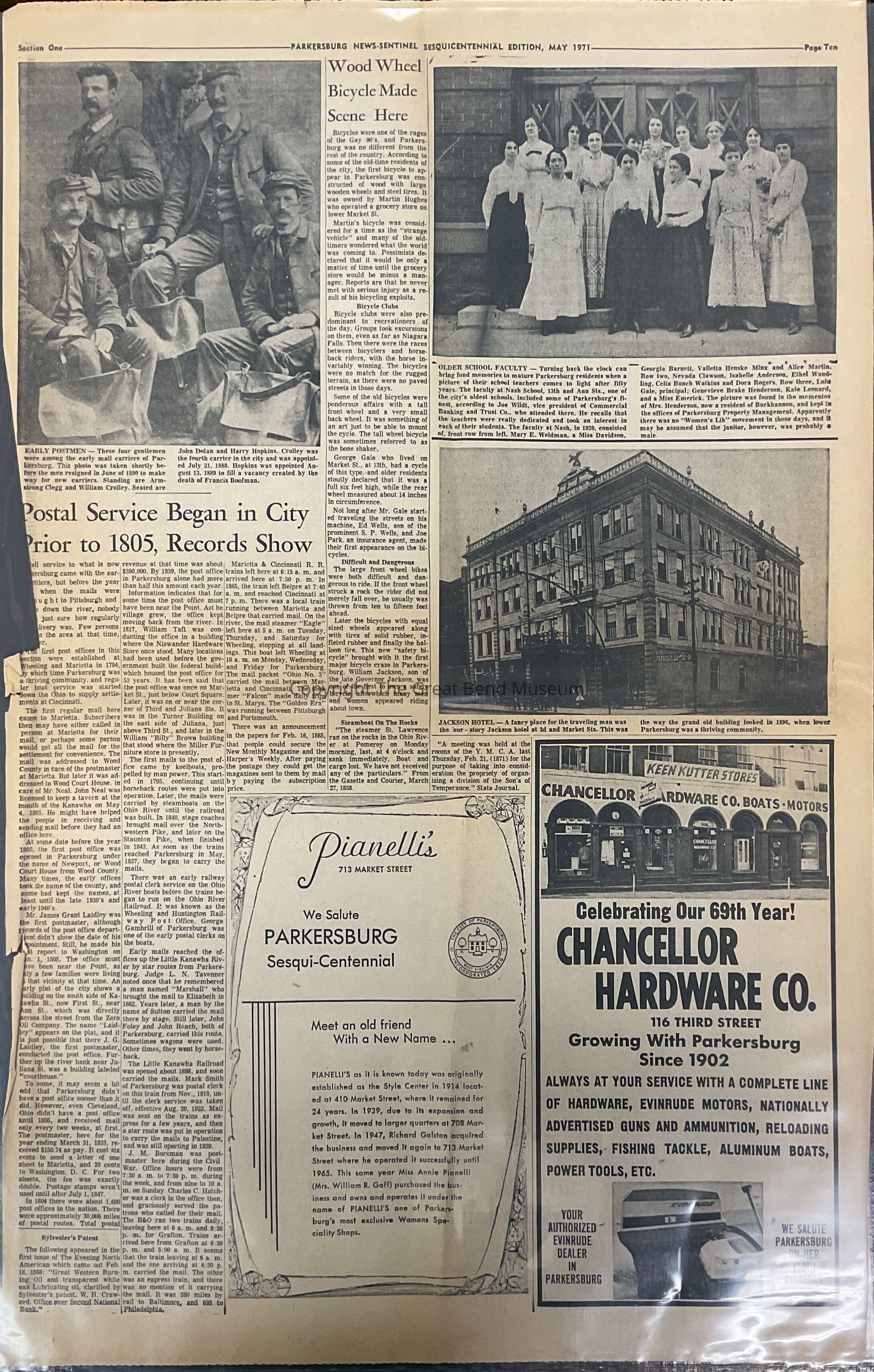 Page 10 - Articles: Postal Service began in city prior 1805, records show - Picture of four gentlemen who were among the early mail carriers of Parkersburg; Wood Wheel Bicycle Made Scenes Here; Picture of Older School Faculty - 50 years ago of the Nash School, 13th + Ann Its.(?); Picture of Jackson Hotel on 3rd + Market Sts. (?) from 1896. Various advertisementsAcquisition