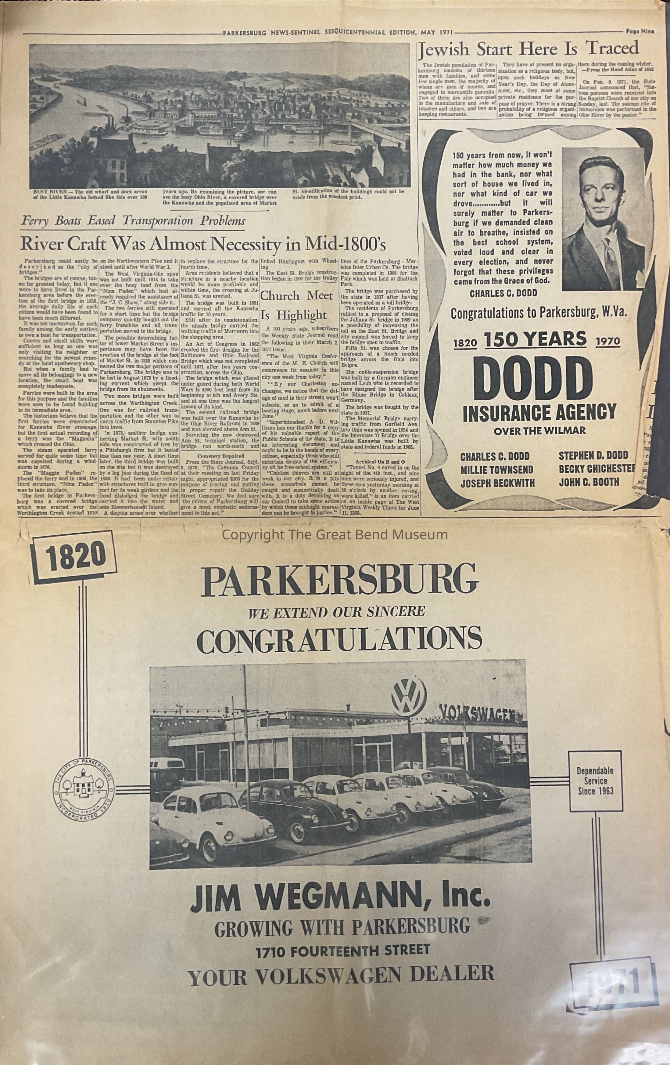 Parkersburg News-Sentinel, Sesquicentennial Edition. Page 9 - Articles: Ferry Boats eased transportation problems - River craft was almost necessity in mid 1880's. Picture of the old wharf and dock areas of how it looked over 100 years ago - Ohio River + Little Kanawha - "Jewish Start Here is Traced" - The Jewish population of Parkersburg consisted of 13 men with families and a few single men - from the Hand Atlas 1882.