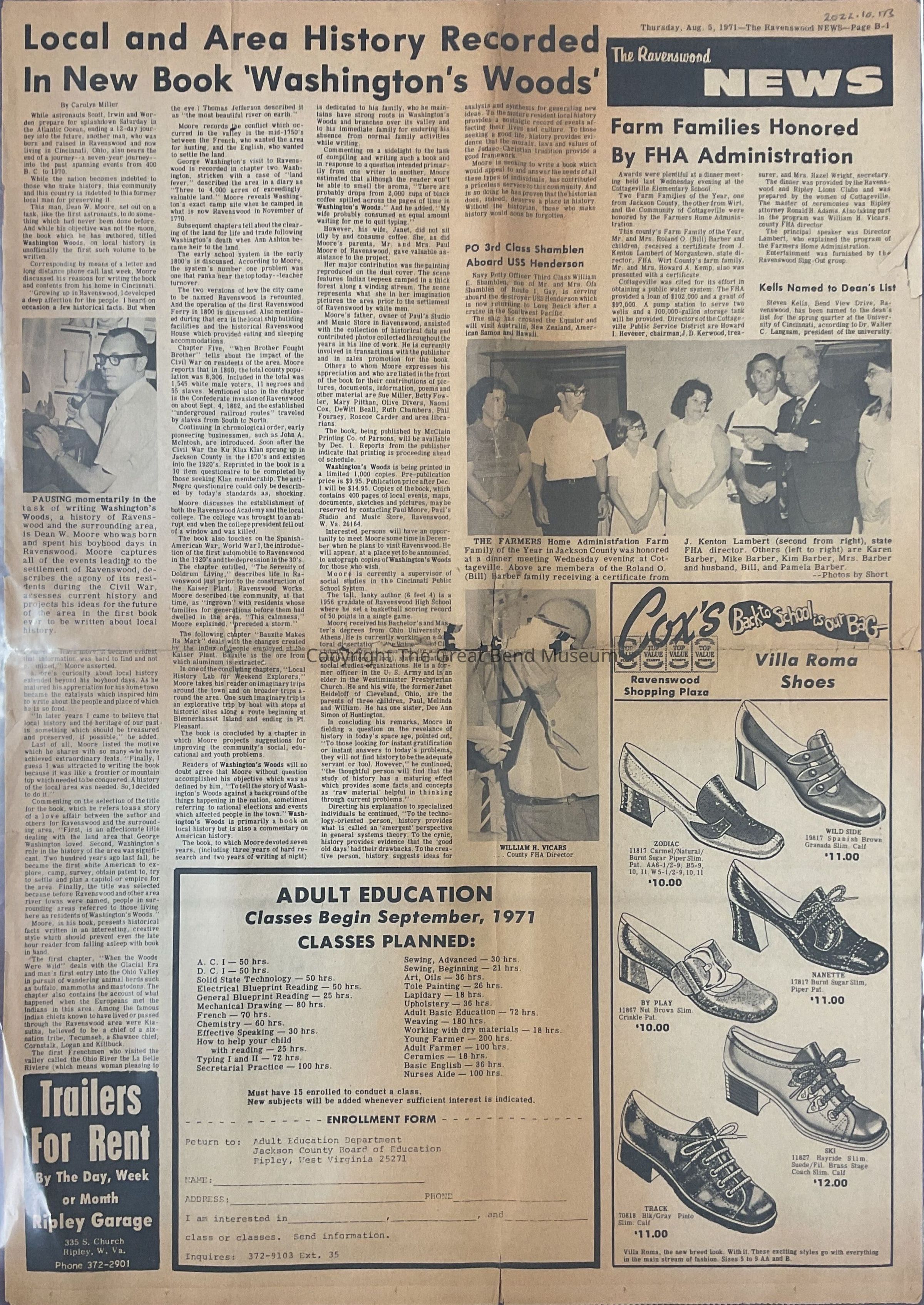 Articles: Local and Area History Recorded In New Book "Washington's Woods" by Dean W. Moore; Farm Families Honored by FHA Administration - Jackson County Family Bill Barber; Scouting Speech Contest Announced; "Operation Rescue" Supplies Shoes for Jackson County Children; 150 youngsters Attend Camp for Needy Children; God's House was Meant to be used by Parson Jones; Read Construction surges at record breaking pace, lesson on crafts to homemakers