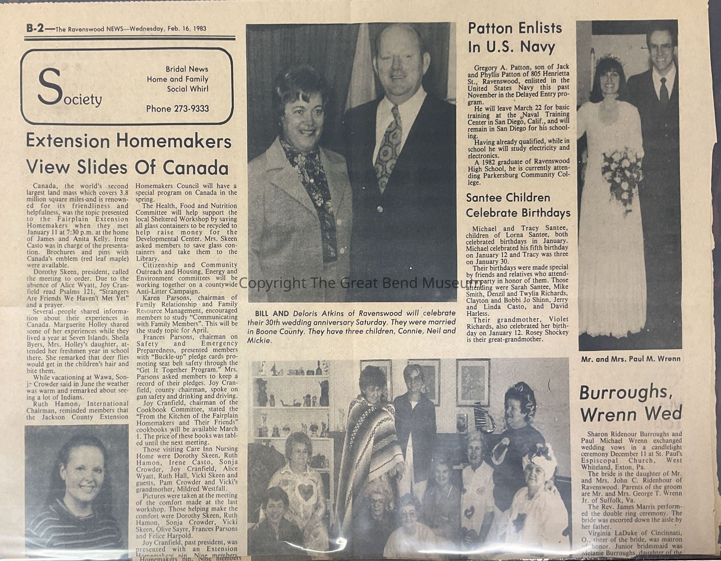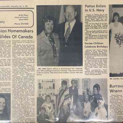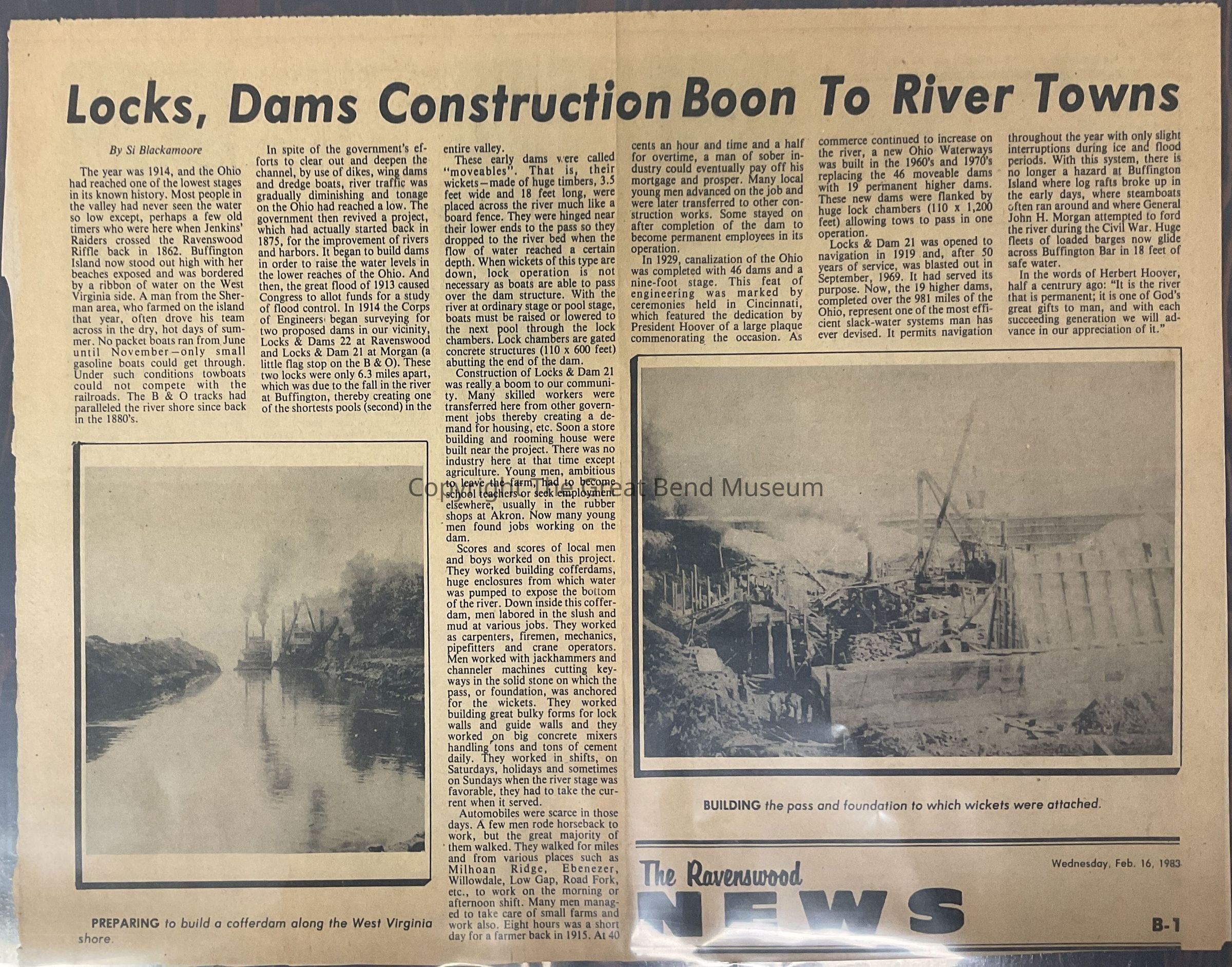 Article: Front - "Locks, Dams Construction Boon to River Towns"; By Si Blackamoore; Pictures: Preparing to build a cofferdam along the West Virginia shore; Building the pass and foundation to which wickets were attached. Back - society page (partial) extension homemakers view slides of Canada; Picture of Bill and Delores Atkins of Ravenswood will celebrate their 30th wedding anniversary; Patton Enlists in U.S. Navy; Santee Children celebrate birthdays Michael 5 years and Lorna 3 years, both in January; wedding picture of Mr. and Mrs. Paul M. Wrenn - former Sharon Ridenhour Burroughs - December 11, 1982.