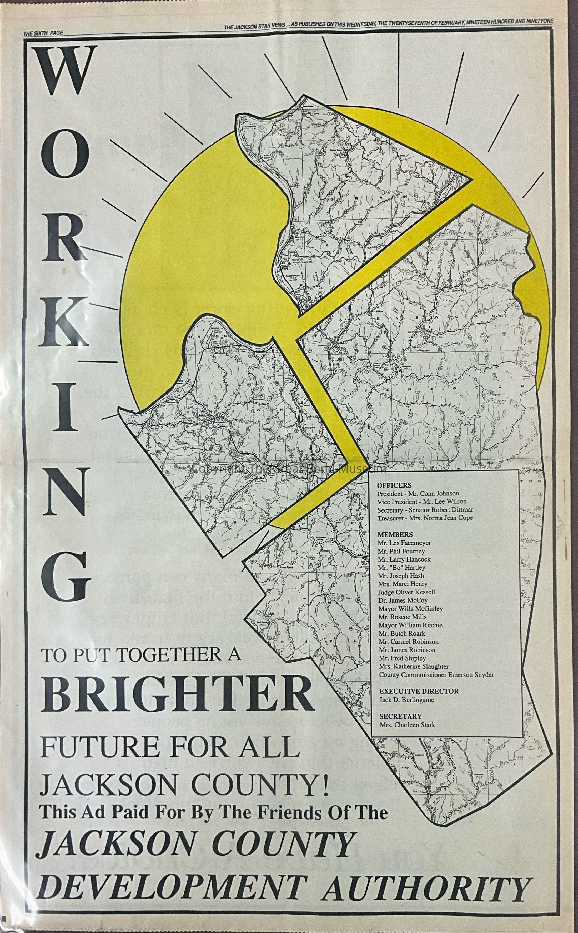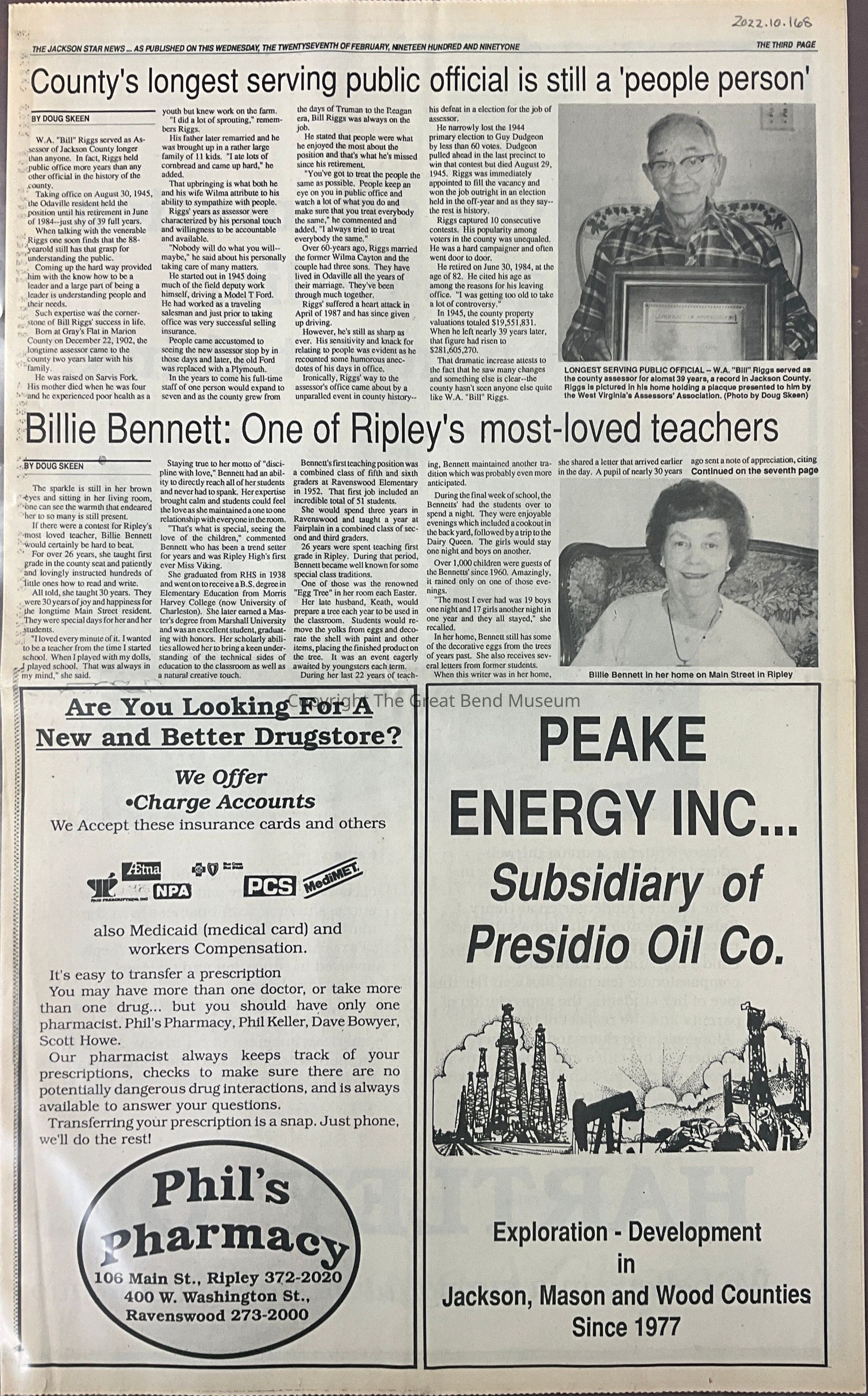 Articles: Country's Longest Serving Public Official is Still 'people person' by Doug Seen; Billie Bennett: one of Ripley's most-loved teachers; Hartley Oil 2 page ad; 1- page ad for Jackson County Developement Authority.Acquisition