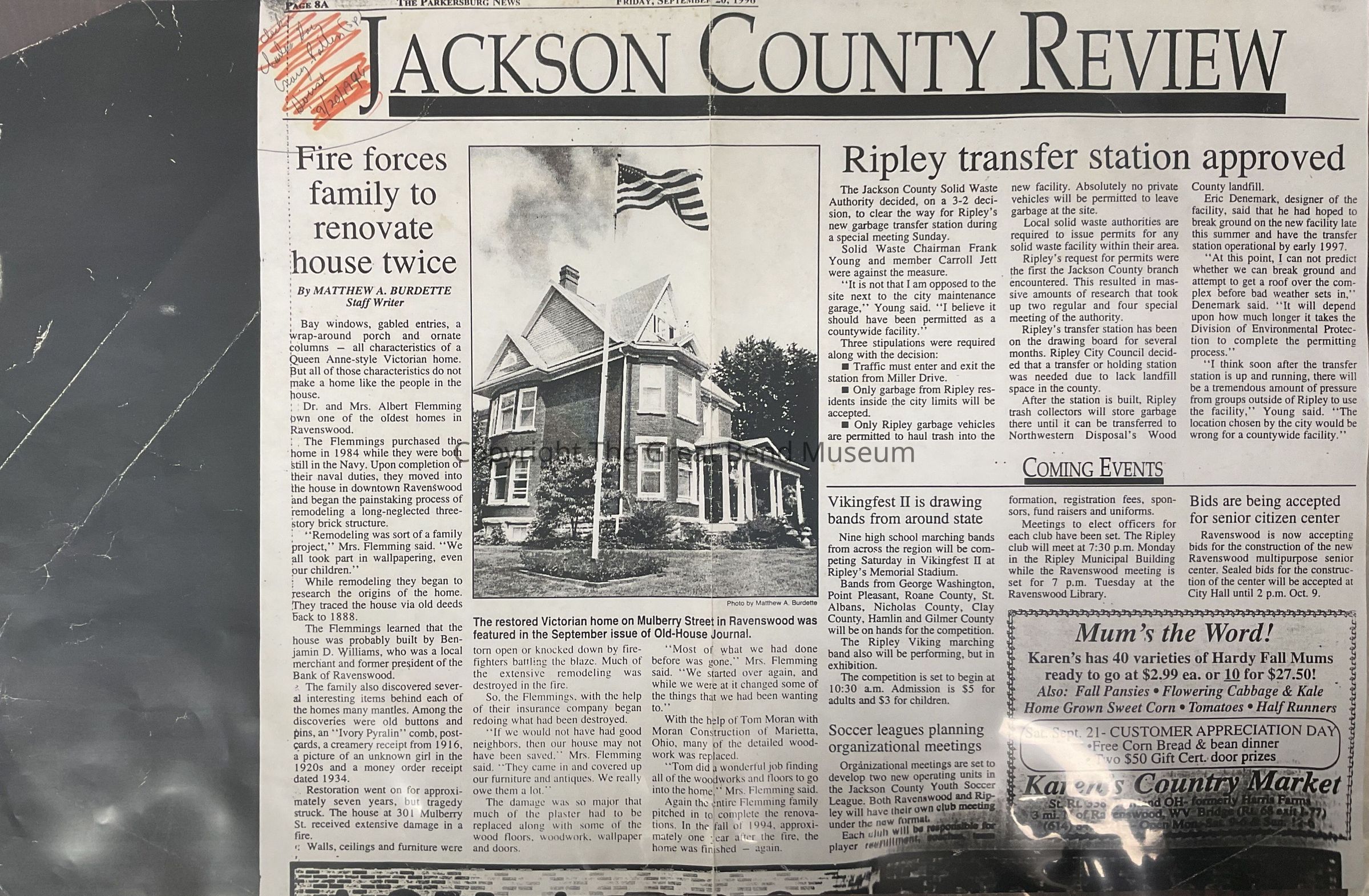 Jackson County Review - Articles: Fire Forces Family to Renovate House Twice, Dr. and Mrs. Albert Flemming at 301 Mulberry Street, The House dates back to 1888. Flemmings purchased it in 1984 and remodeled; approximately 7 years