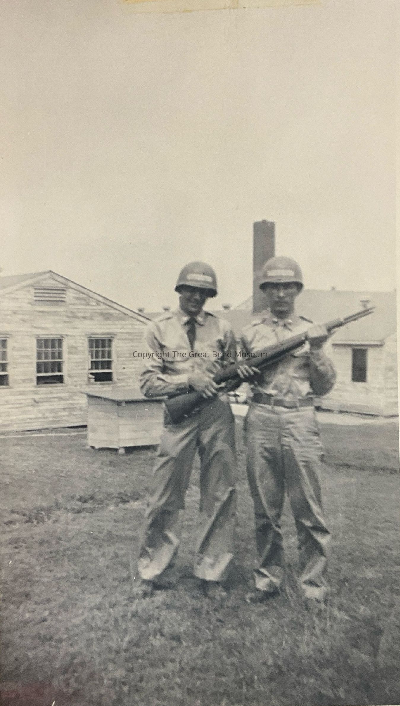 2 soldiers holding 1 rifle, both have helmets, uniforms—standing in front of barracks.