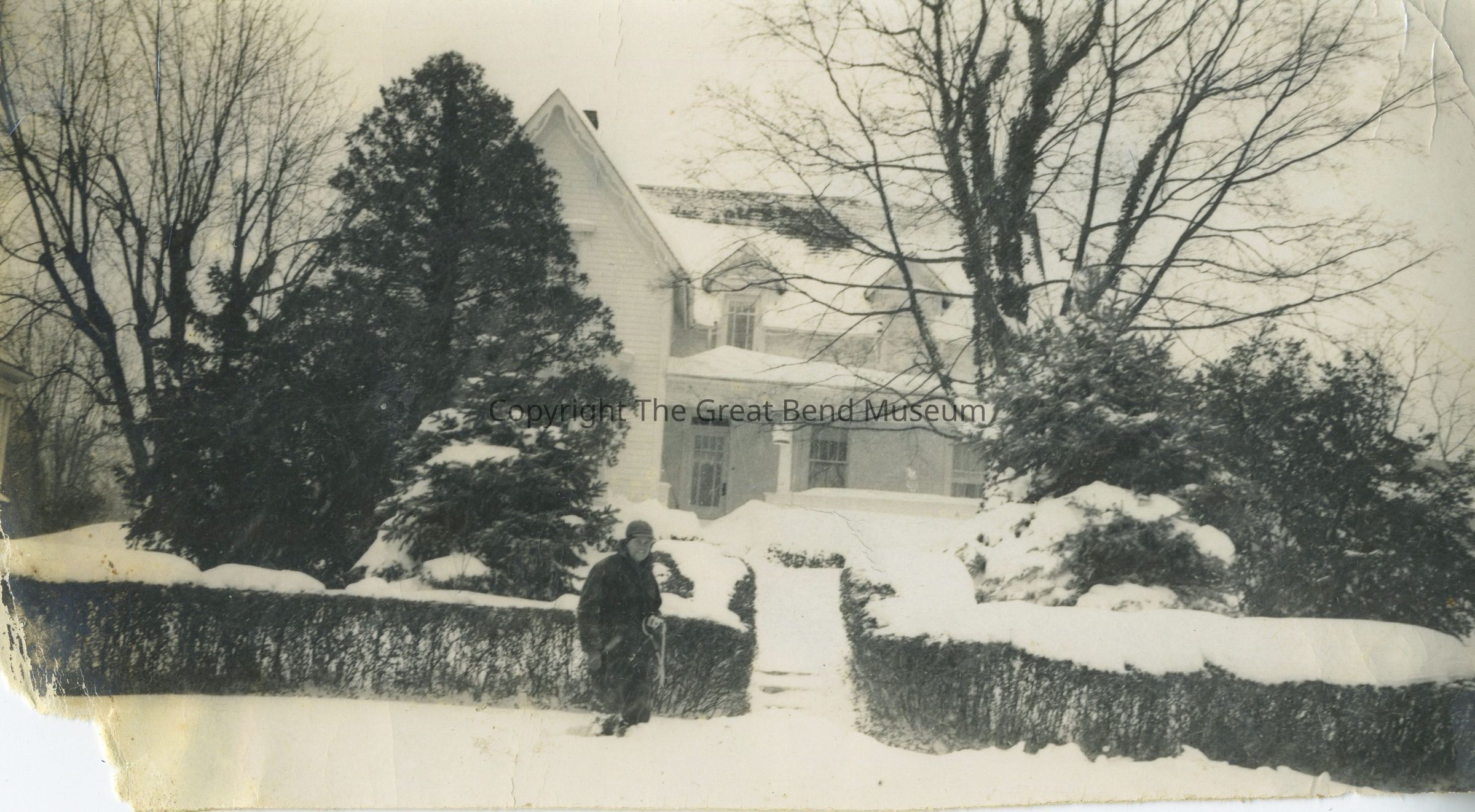 205 Virginia Street in the snow, used to be residence of D E Cole. Black and white photo; winter snow (12'' +) - gentleman in front of white house - now capped hedges.Acquisition