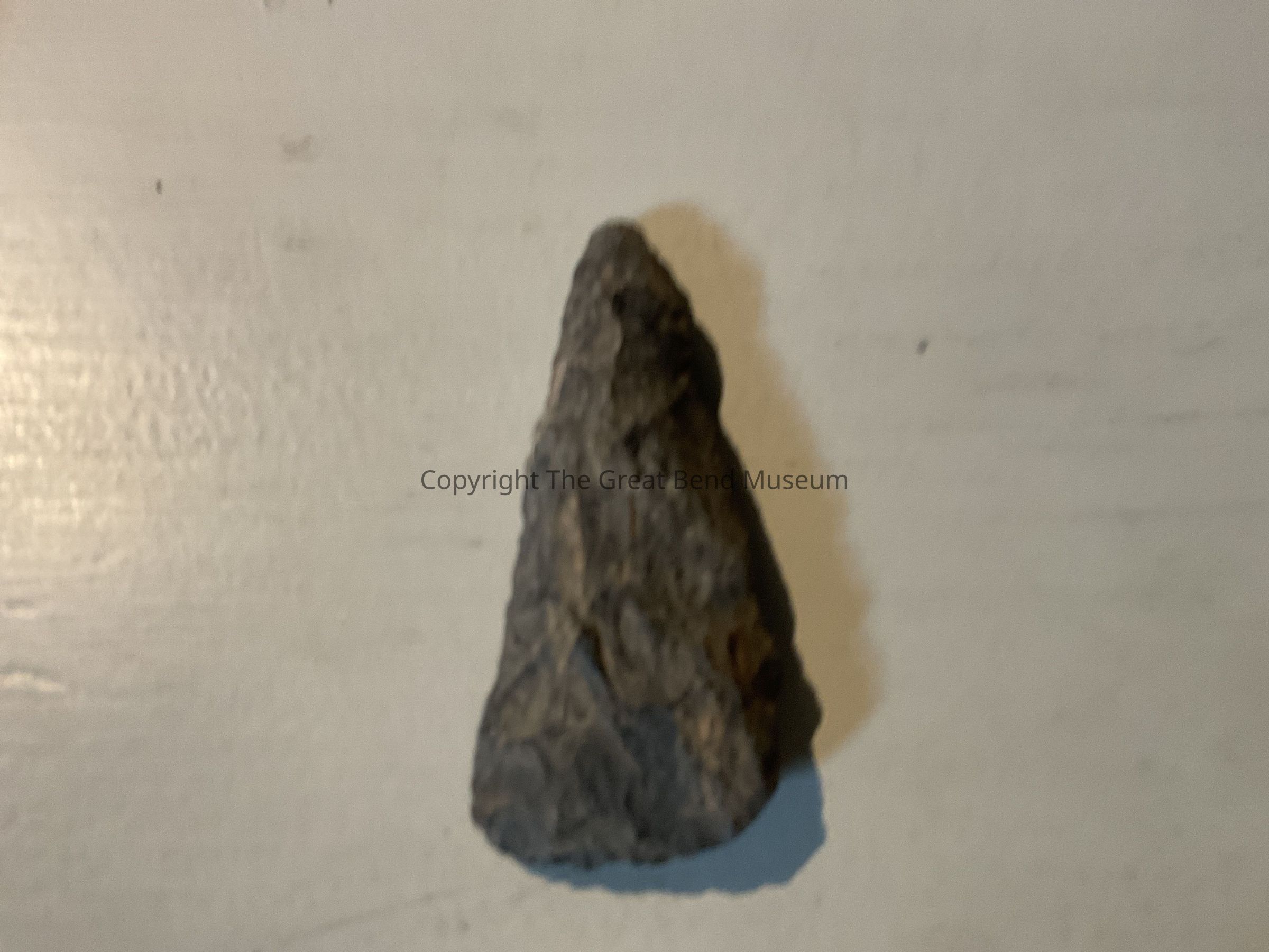 Med Gray wide thin triangular blade. Base is straight to somewhat convex. Light brown on one side with Gray on the opposite. Base is worked thin.Made/Created