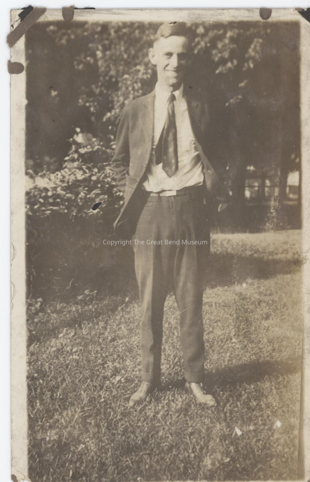 Photograph of Charlie Fast (?) as young man in suit and tie, standing in backyard. postcard back with black paper residue in corners.Photograph Details