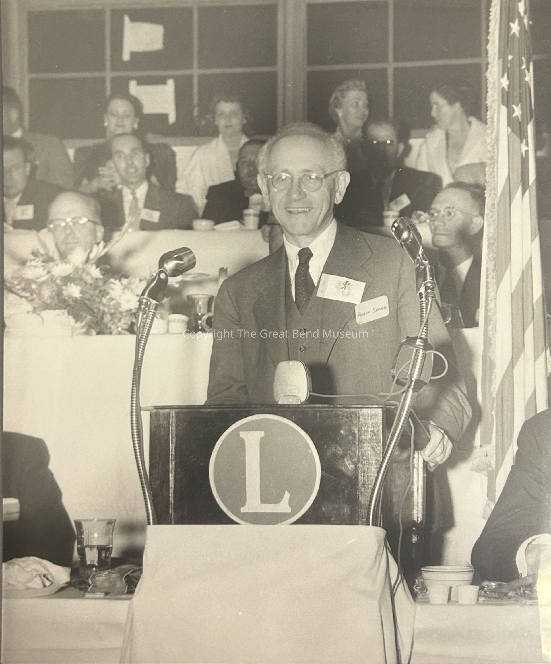 Philip Sporn at podium. Podium has "L" logo on front. Behind Mr. Sporn 2-3 tiers of people. Name tag on coat.