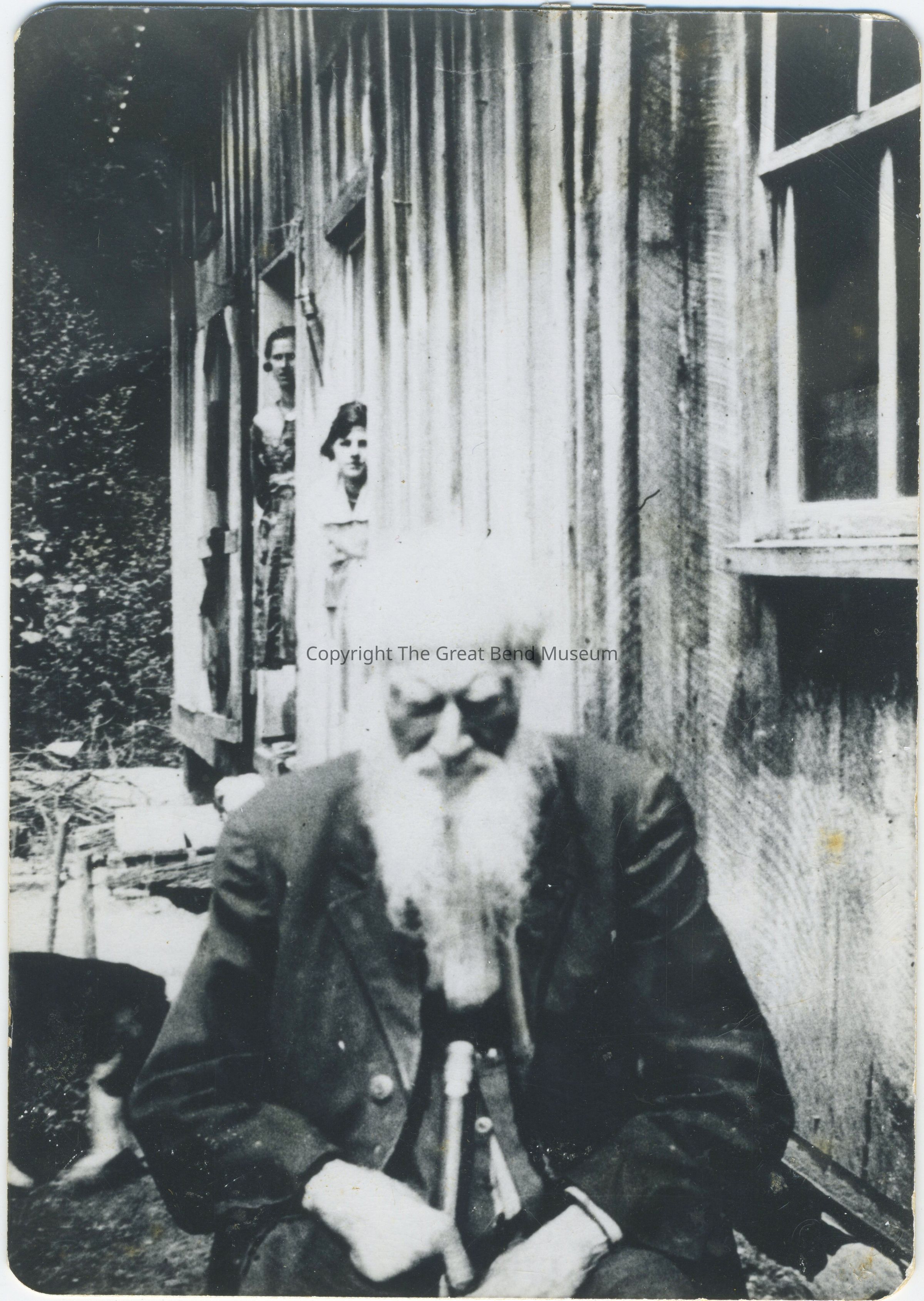 Photo of very old man seated in front of clapboard house. Peter Rhodes who was 117 years old at the home of his son C. M. Rhodes in Evans, WV. Long white beard and snow white hair, sitting on porch of the home. He is holding a cane. 2 female family members peeking out watching Mr. Rhodes getting his picture taken.