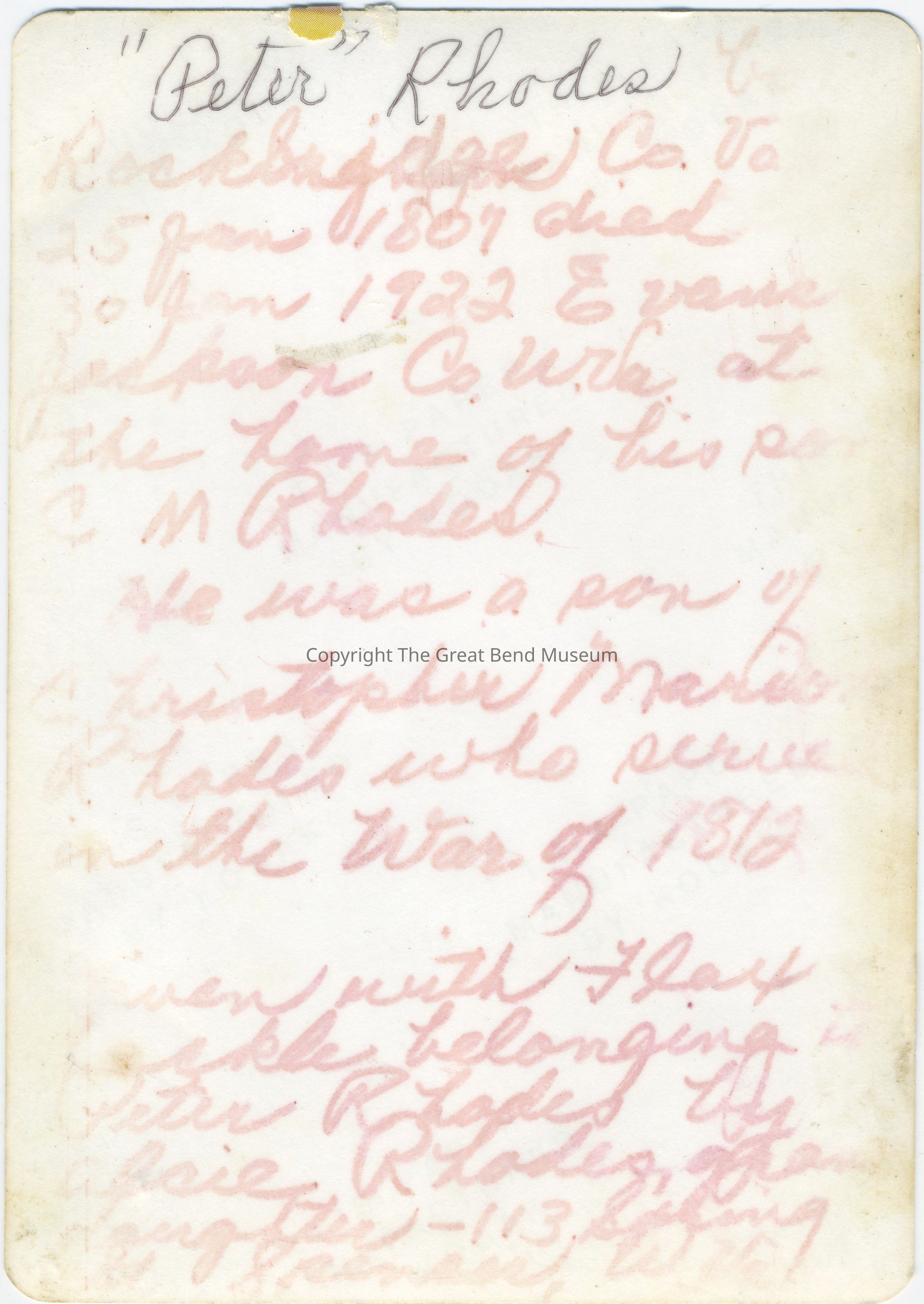 Written on back: Picture of Peter Rhodes age 117 years. Born January 30, 1807, Rockbridge Co. VA. Died Evans, Jackson County, Jan. 30, 1922. His father Christopher Marion Rhodes served in the War of 1812.Acquisition