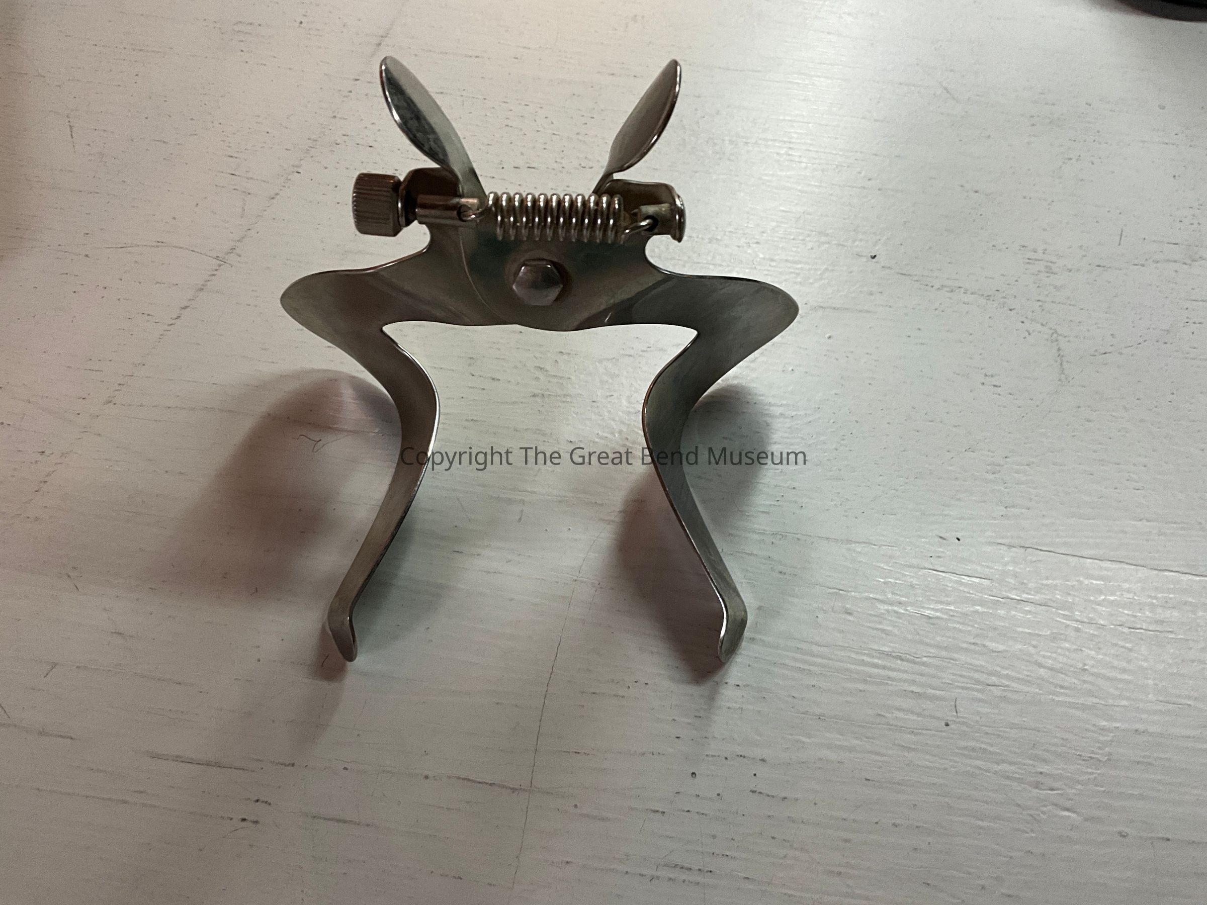 Butterfly shaped retractor (retractor holds skin or tissue back from work area during surgery) It has a spring loaded hinge to keep pressure to hold it open. Both blades are curved inward. Top has curved handles to pinch together which opens the retractor all the way, to put it in place.Acquisition