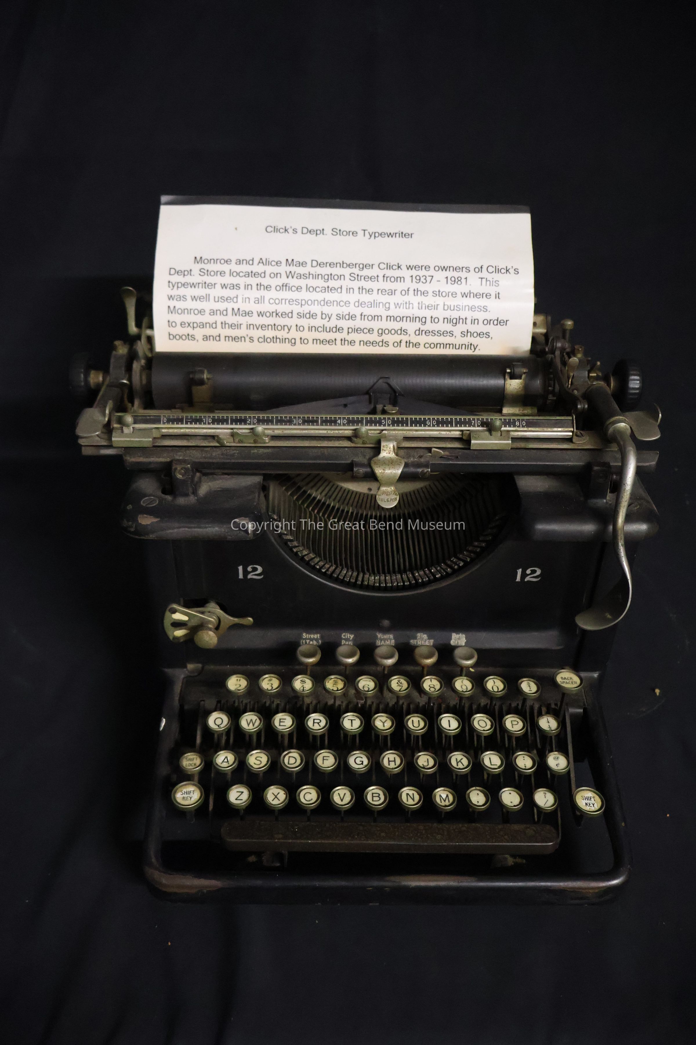 Black office typewriter with numbers "12" - "12" in silver on front left and right sides. Keys are white enamel with black letters. Stainless steel return arm. Came from Clicks Dept. Store in Ravenswood.Acquisition
