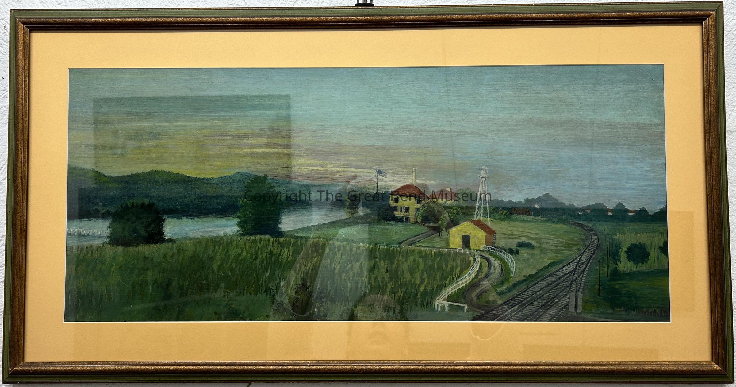 Overall, the painting is in fair condition. The cardboard support is degraded, brittle, and exhibits numerous areas of damage around its edges and the perimeter of the surface. There are two holes in the support with associated loss to the paint layer at the top, center (see right). There is a diagonal split in the lower right corner that is vulnerable to loss and visually distracting. The split is adjacent to a 1” x 1 ½” loss to the topmost painted surface. There is also an old crease with a raised edge in the lower left corner. The paint layer is generally in good condition apart from areas of horizontal cracking at the top center that appear to be slightly lifting from the cardboard surface. There are also small amounts of matte overpaint concealing old areas of damage and splatter in the green foreground and background. The painting exhibits heavy soiling, stray marks, and abrasions overall. Water damage has caused lighter vertical streaks, mainly visible through the sky. Contact with a previous matboard has cause matburn on surface of the painting. The matburn affects the other ~1” of the composition and is most visible along the top, left and right edges (see below).