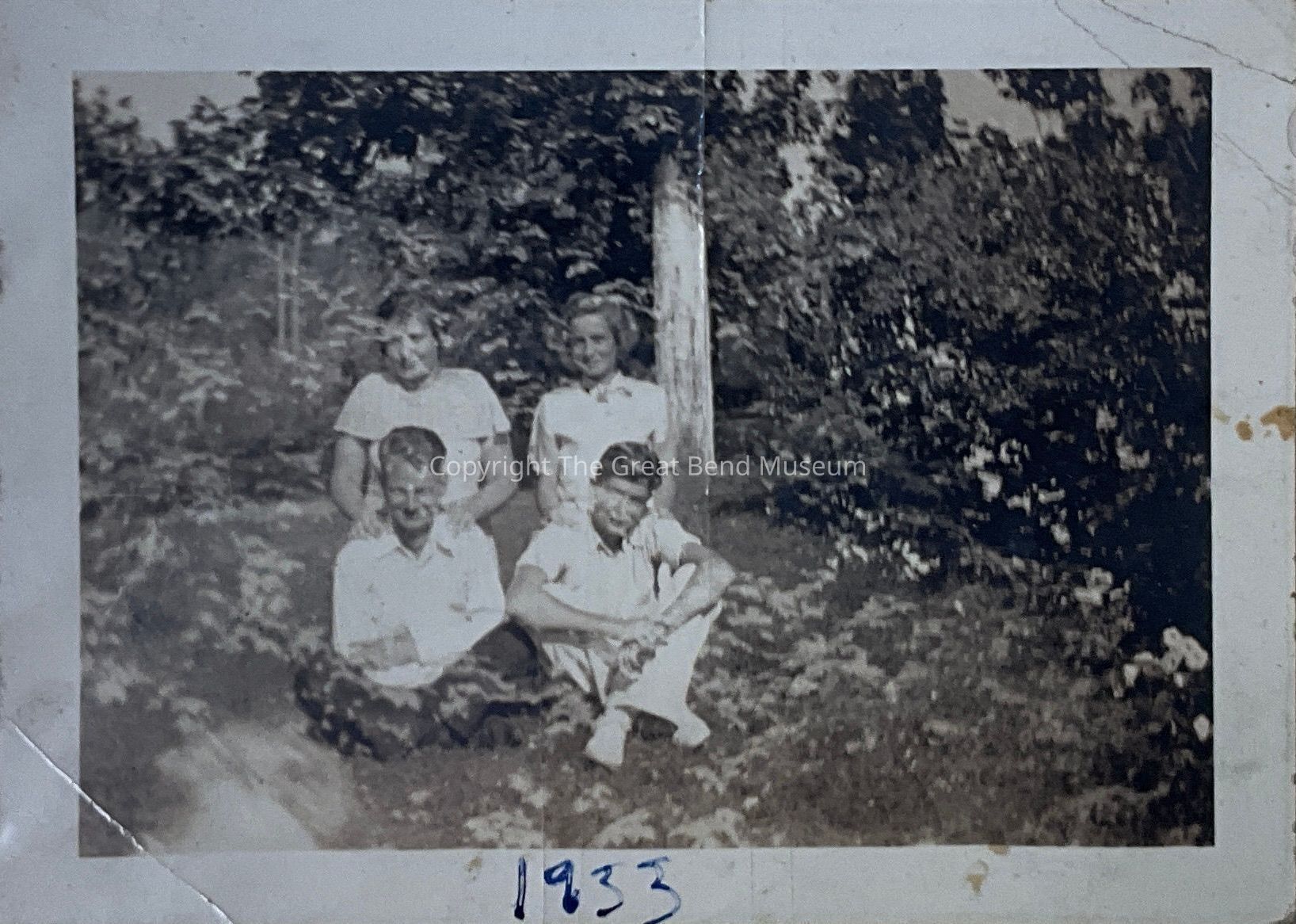 Photo of 4 unidentified people, 2 male, 2 female sitting underneath a tree on a slight bank. Men are sitting front with the women sitting directly behind them. All have short sleeves, appears to be warm weather. 1933 is written in blue ink at the bottom of the photo.Acquisition