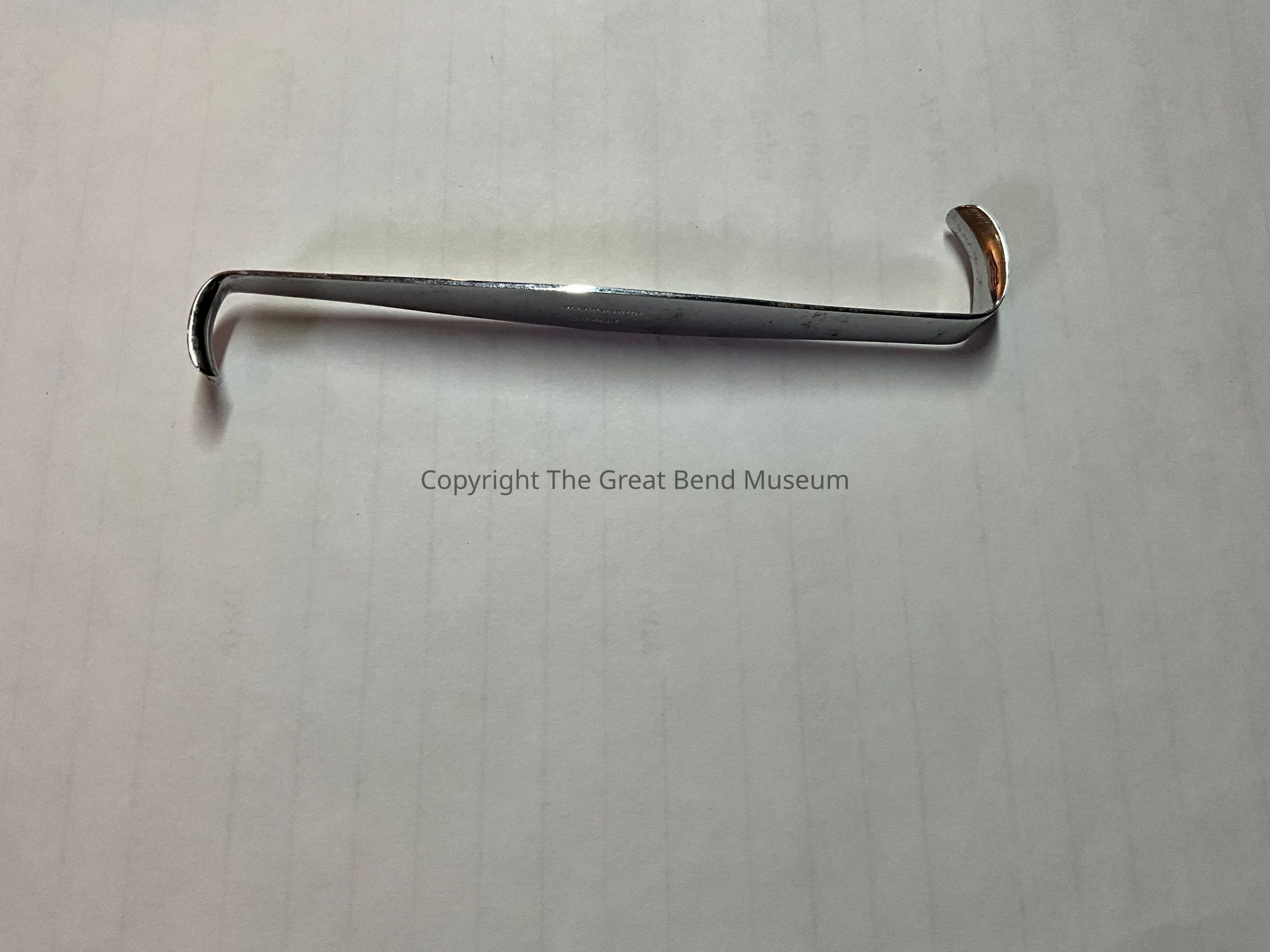 Flat metal rod with curves at both ends. One curves to the lef and one to the right. Has Sharp Smith embossed on one side and Germany on the other. Also has the word “Chrome” on on side of the flat metal. Used to hold back tissues, organs, or skin during surgery.Category