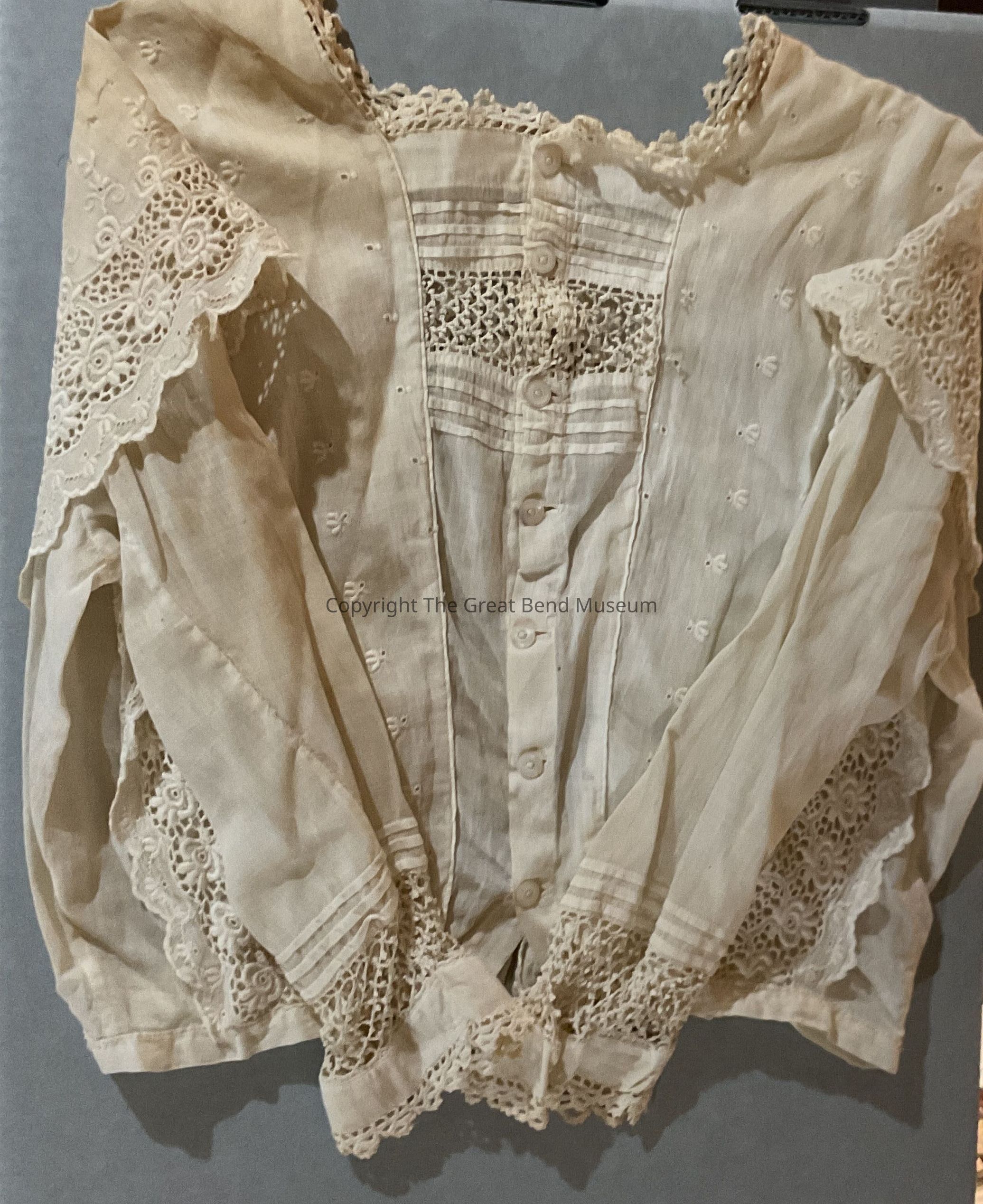 White overshirt with lace trim and embellishments. 7 buttons, square necklace, handmade.Clothing/Dress/Costume Details