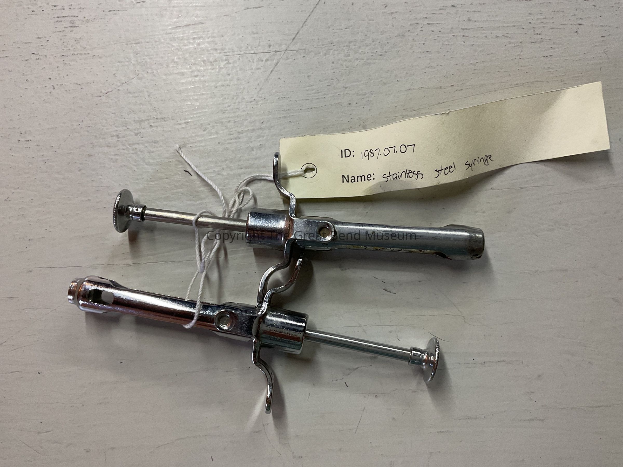 Stainless steel injection syringe - 2 pc. cylinder and plunger, flat disc on top of plunger, 2 arms extended for finger holds