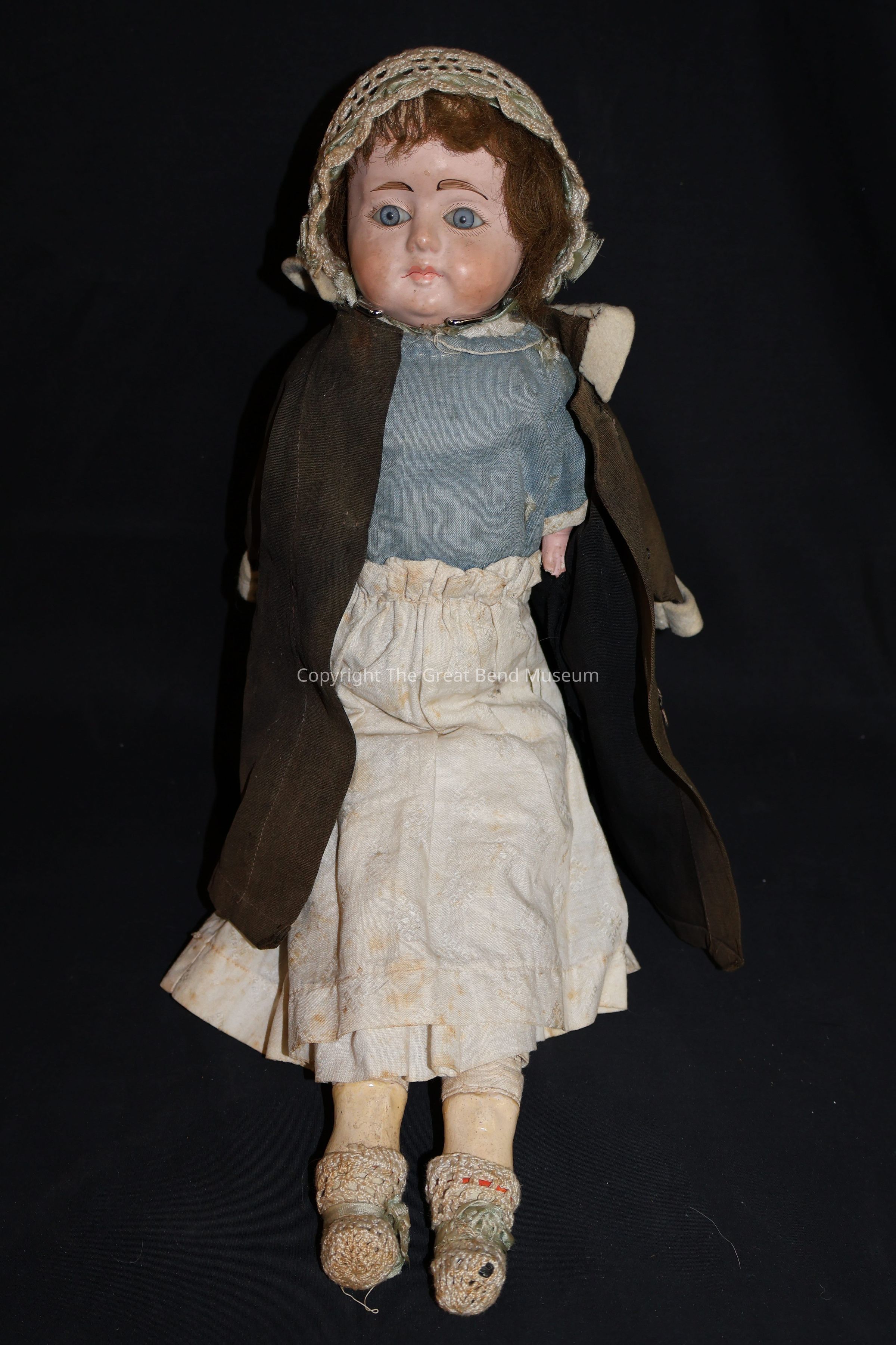 Composition head, hands, feet. Glass eyes, mohair hair. Blue bodice dress white skirt, white crochet bonnet with faded blue ribbon, brown coat. Painted socks.Acquisition