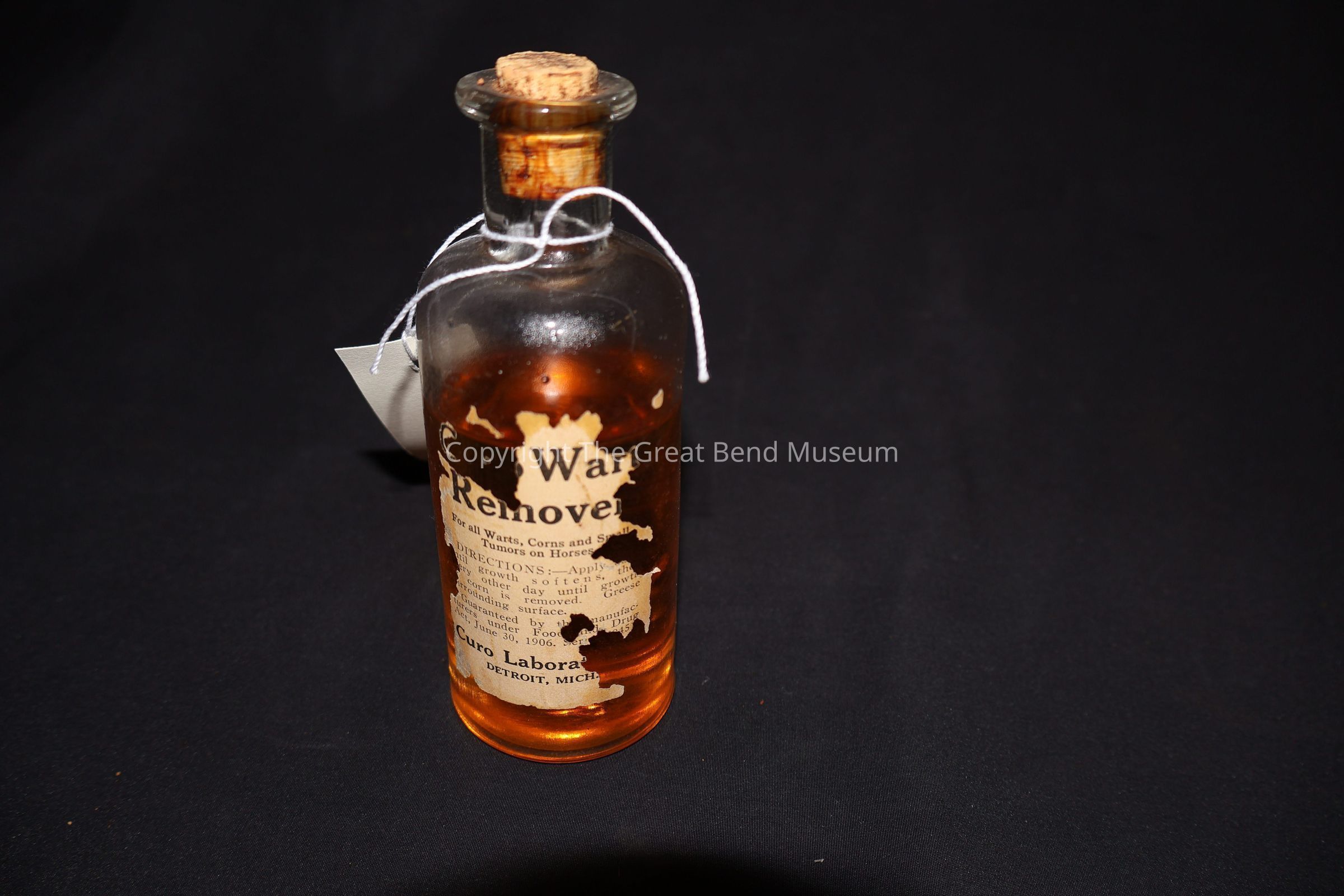 Clear smaller round bottle with 2.75 cm neck with cork stopper intact. It is 3/4 full of amber liquid. Label on front is very deteriorated - can barely make out wart remover. Also has directions and "Curo Laboratory - Detroit Mich"Acquisition
