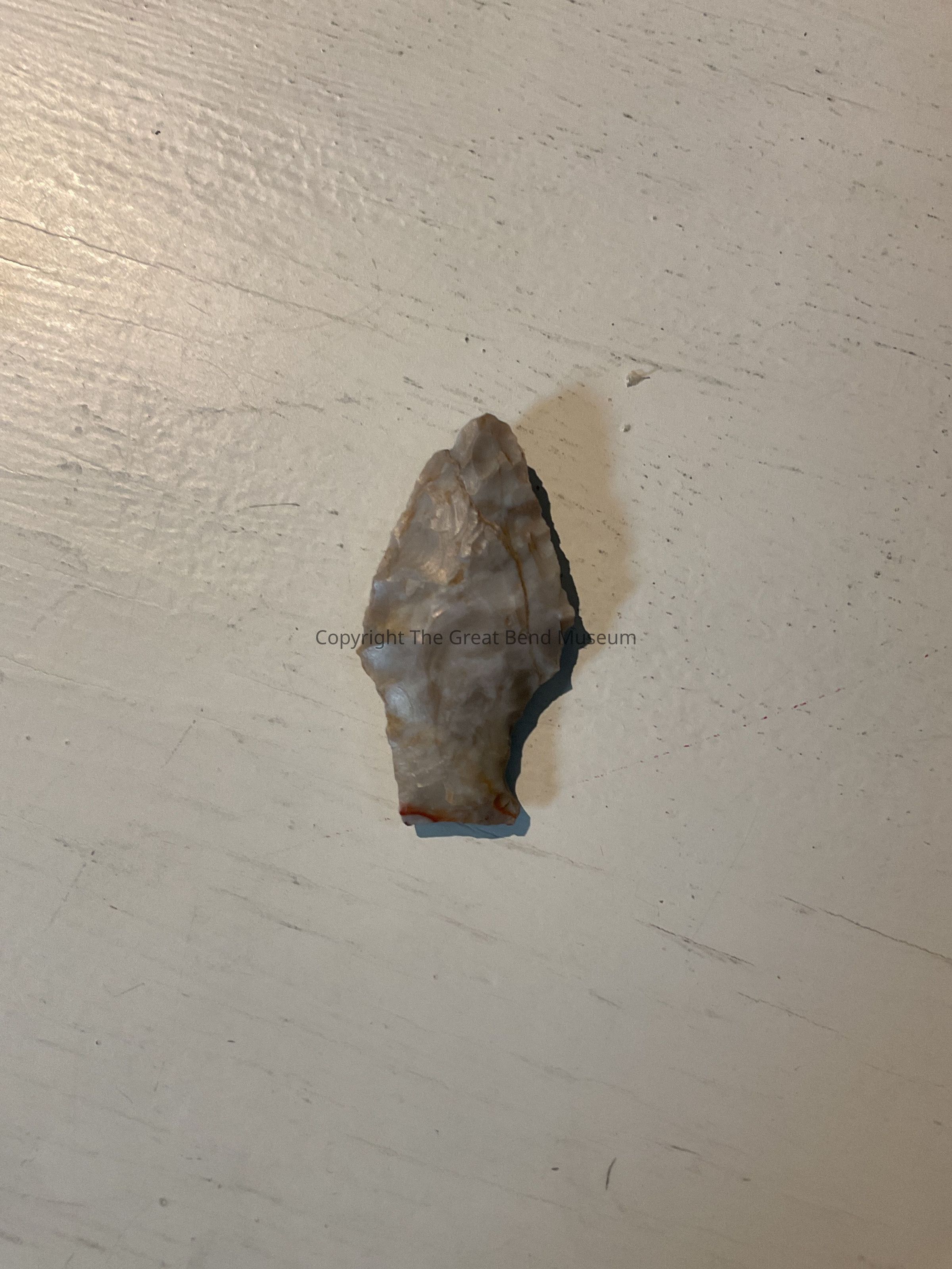 Light Gray with swirls of brown, flat in center. Used as a knife or preform for corner notched or raccoon notched points. Pentagonal shaped with straight basal edge On stem. Stem is prominent with one side slanted.Acquisition