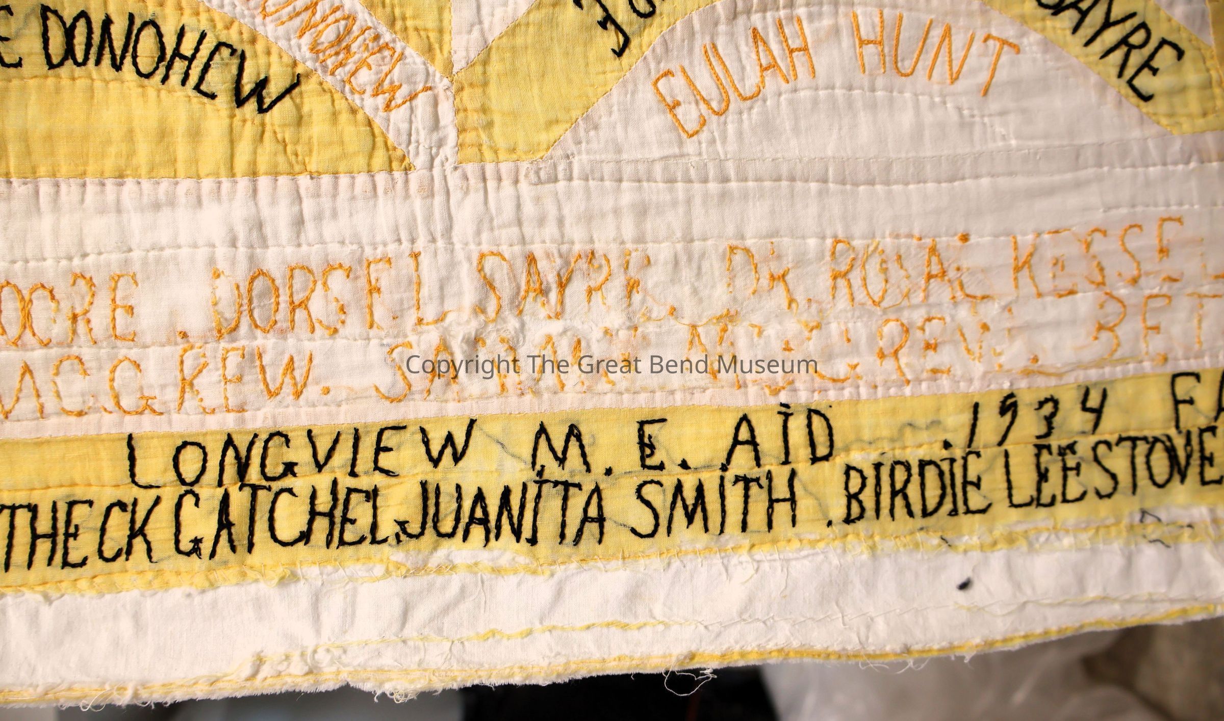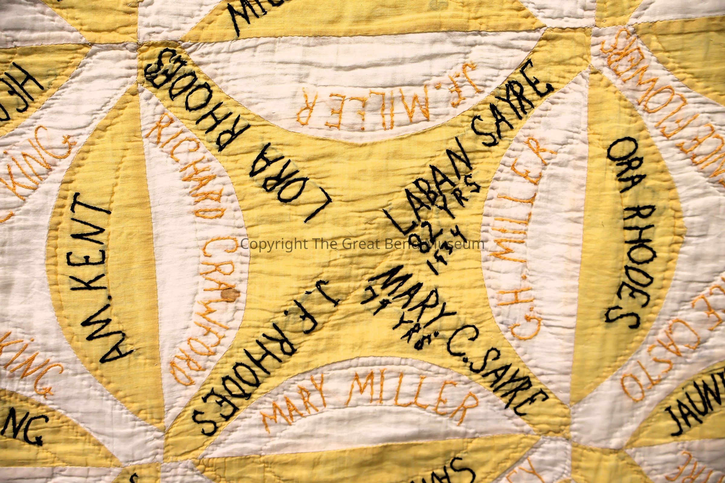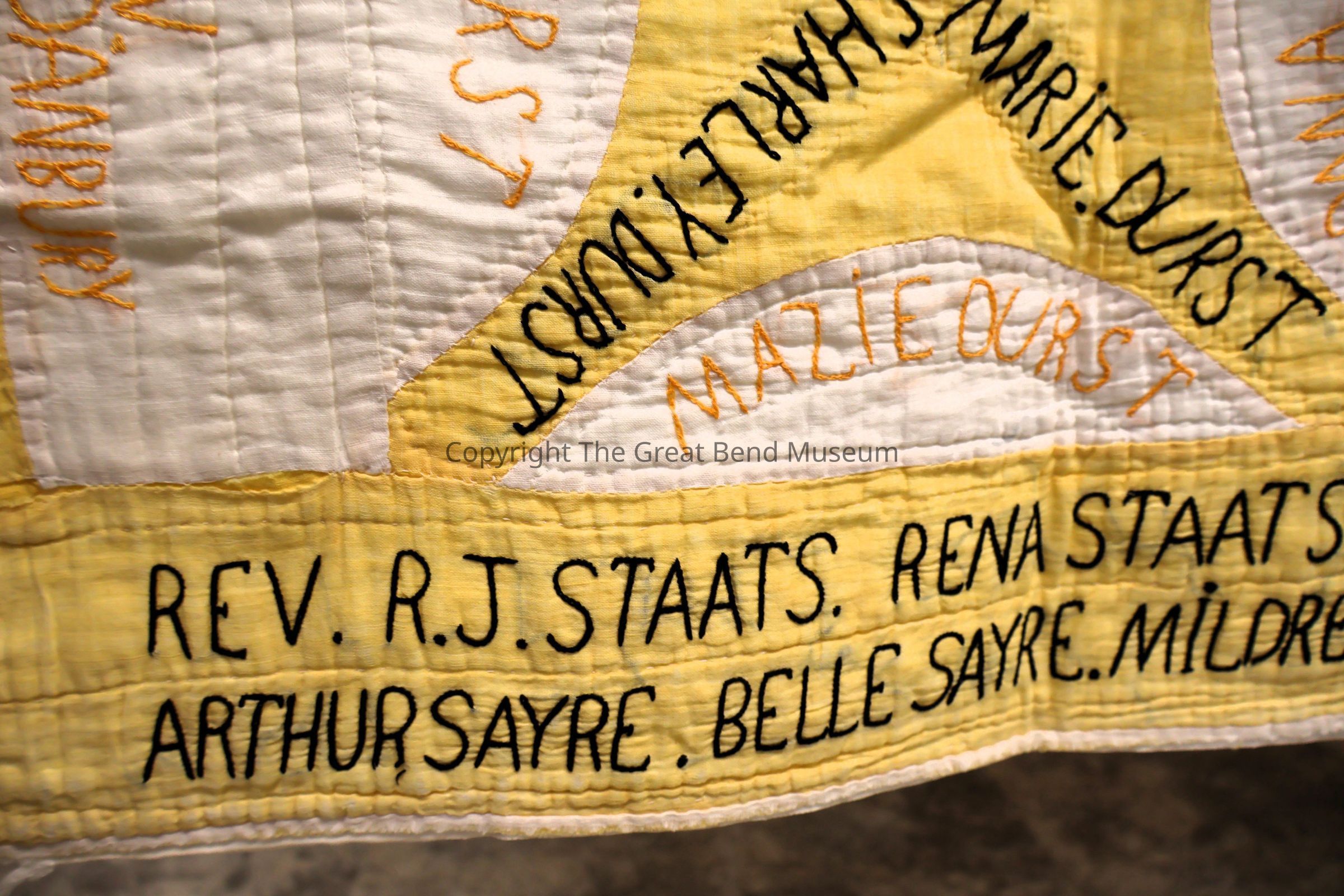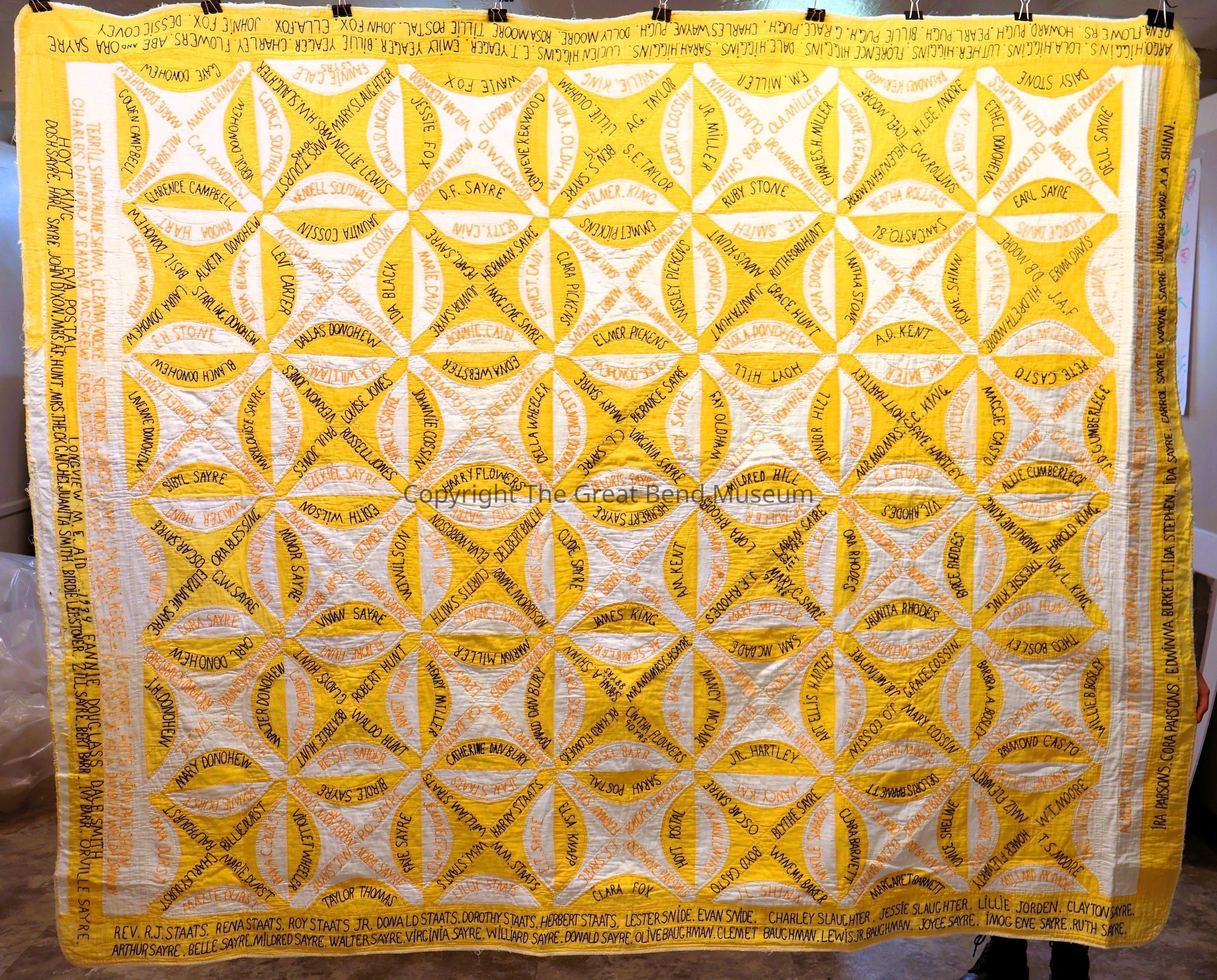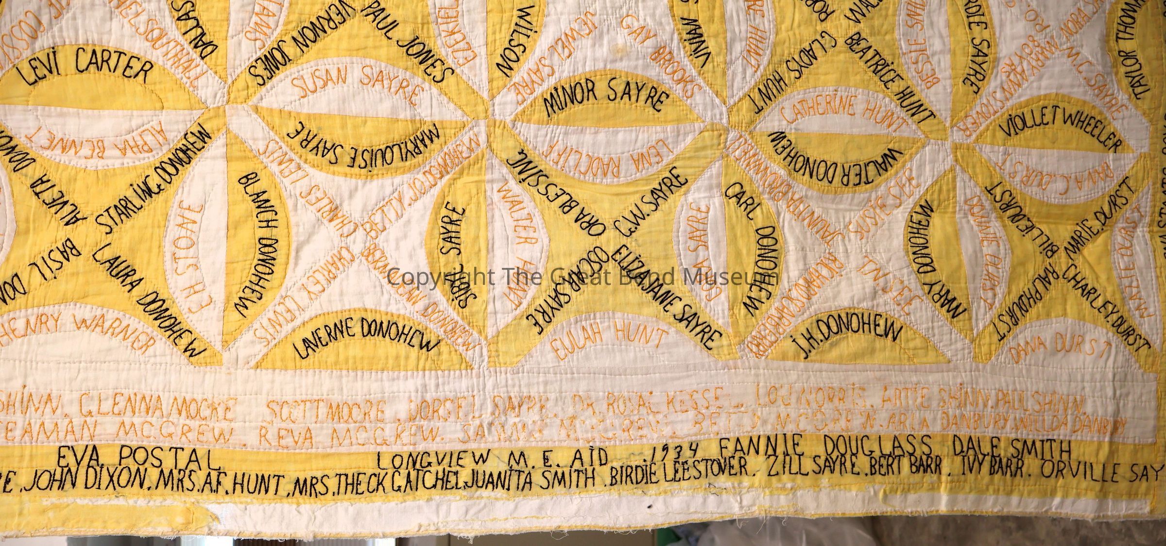 Names on the Quilt: Rev RJ Staats, Rena Staats, Roy Staats Jr, Donald Staats, Dorthy Staats, Herbert Staats, Arthur Sayre, Belle Sayre, Mildred Sayre, Walter Sayre, Virginia Sayre, Willard Sayre, Donald Sayre, Olive Baughman, Clemet Baughman, Lewis Jr Baughman, Joyce Sayre, Imogene Sayre, Ruth Sayre, Esther Snide, Evan Snide, Charley Slaughter, Lillie Jordan, Clayton Sayre. Clara Fox, Josephine Parsons, Robert Parsons, Hoyt Postal, JW Mullinex, Oscar Sayre, Boyd Casto, JL Shinn, Blythe Sayre, Nancy Kay, Sarah Postal, Wynema Baker, Myrtle Saharnt, Clara Barnett, Deloris Barnett, Orabell Barnett, Donald Barnett, Roy Barnett, Margaret Barnett, Elzina Barnett, Unice Sheline, Commodore Baker, Margaret Livingston, Maiz Flewarty, Homer Flewarty, WT Moore, TS Moore, Millard McDade, Dave Livingston, Raymend Casto, Barbara A Basley, Theo Basley, Willie Basley, Hazel Casto, Myrtle Casto, GW Casto, Willard Casto, Pearl Moore, Bedford Moore, Joe McIntyre, Hazel McIntyre, Grace Cossin, Mary Cossin, JB McIntyre, Art Ellis Hartley, Sam McDade, Grace Hartley, Virginia Hartley, Vitus Hartley, Minnie Hartley, Nancy McDade, JR Hartley, Freda Barr, Mr. and Mrs. CH Sayre, Cintha Flowers (90 yrs), AE Scarberry, Russel Barr, Richard Flowers, Sarah A Shinn (88 yrs), Ethel Scarberry, James King, Clyde Sayre, Elsa Knapp, Ferman Sayre, EF Sayre, Mabel King, Mona King, Herbert Sayre, AM Kent, Lara Rhodes, Richard Crawford, JF Rhodes, Mary Miller, Mary C Sayre (74 yrs), Laban Sayre (82 yrs 1934), JF Miller, GH Miller, Ord Rhodes, Grace Casto, Juanita Rhodes, Florence Flowers, Vic Rhodes, AE Flowers, Byre Rhodes, Amanda Hunt, Nora Shinn, Tressie King, Clara Hunt, Ivy L King, Harold King, J O Shinn, Madaline King, L O Hunt, Allie Cumberledge, Gale Casto, J D Cumberledge, Francis Casto, Pete Casto, Maggie Casto, Juanita Miller, Vinton Casto, AT Pullins, Faye Hartley, C F Hunt, Mr. and Mrs. C C King, Hoyt Hartley, Lizzie Baier, Val Baier, Junior Hill, Marie Hill, C A Hill, Mildred Hill, Elva Hill, Hoyt Hill, Fay Oldham, Donnie Hill, Leroy Sayre, Virginia Sayre, Bernice Sayre, Olive Donohew, Deloris Sayre, Mary Sayre, C L Sayre, Glenner Donohew, Elmer Pickens, Mebel Pickens, Clara Pickens, Sam Pickens, Emmet Pickens, Amanda Donohew, Homer Donohew, Wesley Pickens, Viola Donohew, Ray Donohew, H E Smith, Lona Donohew, Grace Hunt, Juanita Hunt, Annis Hunt, Rutheord Hunt, Juanita Stone, San Casto (86), Rome Shinn, A D Kent, Darrel Sayre, Chloe Sayre, Wink Cunningham, Wayne Dansbury, G F Friese, J W McClary, Elsie Davis, George Davis, D B Moore, Erma Davis, J A F, Hildreth Moore, Daisey Stone, Dell Sayre, Earl Sayre, Ethel Donohew, Eliza Hughes, Dannie Donohew, Mabel Fox, O E Donohew, Raymond Kerwood, Loraine Kerwood, Bertha Rollins, Gail Brown, Helen Jean Moore, Icyel Moore, Helen Moore, G W Rollins, Charles H Miller, F M Miller, Ruby Stone, J R Miller, Oliver Shinn, Ola Miller, Dr. Warren Miller, Bob Shinn, Golden Cossin, A G Taylor, S E Taylor, Wilmer King, Willie King, Lillie Oldham, Viola Oldham, Ben S Sayre (79), Alberta Shinn, Everett Parsons, Marion Flowers, Margret Wheeler, Harry G Parsons, Opal Rollins, Darrel Livingston, Ethel Sayre, Francis Sayre, Clarance Ankrum, Edna Kay, Curtis Smith, Elva Morrison, Delbert Balch, Rayne Morrison, W J Wilson, Edith Wilson, Minor Sayre, Vivian Sayre, Ottmer Fox, Richard Sayre, Gay Brooks, Jewel Sayre, Lena Radcliffe, Walter Hunt, Eulah Hunt, Lora Sayre, Ora Blessing, GW Sayre, Eliza Jane Sayre, Oscar Sayre, Carl Donohew, Walter Donohew, Mary Donohew, JH Donohew, Richard Scarberry, Juanita Brownell, Susie See, T N See, Catherine Hunt, Elnore Hunt, Garnet Hunt, Bessie Snider, Gladys Hunt, Robert Hunt, Usaldo Hunt, Beatrice Hunt, Henry Miller, Marion Miller, Donald Danberry, Catherine Danberry, Lewis Danbury, Georgia Danbury, Mary L Danbury, G E Danbury, E T Sayre, Lillie Staats, Jemmie Staats, Jean Staats, Harry Staats, MM Staats, WW Staats, William Staats, Faye Sayre, Birdie Sayre, Violet Wheeler, Taylor Thomas, Mary Ann Stover (80), RO Sayre, Nora Sayre, MC Sayre, Dana C Durst, Donnie Durst, Dana Durst, Mazie Durst, Marie Durst, Billie Durst, Charley Durst, Ralph Durst, Sibyl Sayre, Mary Levise Sayre, Blanch Donohew, Laverne Donohew, Charley Lewis, Charles Lewis, Betty Jo Donohew, Bernadean Donohew, Susan Sayre, Ola Williams, Shirley Sayre, Ezekiel Sayre, Paul Jones, Vernan Jones, Lavise Jones, Russel Jones, Johnnie Cossin, Harry Flowers, Della Wheeler, Edna Webster, Ivy Flowers, Blanche Flowers, Elnore Flowers, Joe Flowers, Bonnie Cain, Ernest Cain, Betty Cain, Marie Cain, Pearl Sayre, Herman Sayre, Imogene Sayre, Junior Sayre, Ida Black, Juanita Cossin, Levi Carter, Dallas Donohew, Lillie Cossin, Ersie Cossin, Ethel Southall, Lelia Southall, Alpha Bennet, Rhoda Hart, Henry Warner, E H Stone, Alveta Donohew, Starling Donohew, Laura Donohew, Basil Donohew, Golden Campbell, Gaye Donohew, Vergil Donohew, Clarence Campbell, Mamie Donohew, C M Donohew, Melvin Donohew, Marie Donohew, George Southall, Fannie Gale (65 yrs), Georgia Slaughter, Wendell Southall, Mrs. T Durst (70), Mrs. HW Slaughter, Mary Slaughter, Nellie Lewis, Jessie Fox, D F Sayre, Genneve Kerwood, Wavie Fox, Velma Kerwood, Martha Kerwood, D W Kerwood, Clifford Kerwood, Terrill Shinn, Pauline Shinn, Glenna Moore, Scott Moore, Dorsel Sayre, Dr Rosal Kessel, Lou Norris, Artie Shinn, Paul Shinn, Willda Danbury, Arla Danbury, Betty Moore, Sammy McGrew, Reval McGrew, Seaman McGrew, Charles Danbury, Hoyt King, Dosh Sayre, John Dixon, Mrs. A F Hunt, Mrs. Theck Gatchel, Juanita Smith, Harl Sayre, Eva Postal, Birdie Lee Stover, Fannie Douglass, Zill Sayre, Bert Barr, Dale Smith, Ivy Barr, Orville Sayre, Argo Higgins, Lola Higgins, Luther Higgins, Florence Higgins, Dale Higgins, Sarah Higgins, Rena Flowers, Howard Pugh, Pearl Pugh, Billie Pugh, Grace Pugh, Charles Wayne Pugh, Lucien Higgins, Dolly Moore, ET Yeager, Rosa Moore, Emily Yeager, Tillie Postal, Billie Yeager, John Fox, Ella Fox, Charley Flowers, Johnnie Fox, Dessie Cove