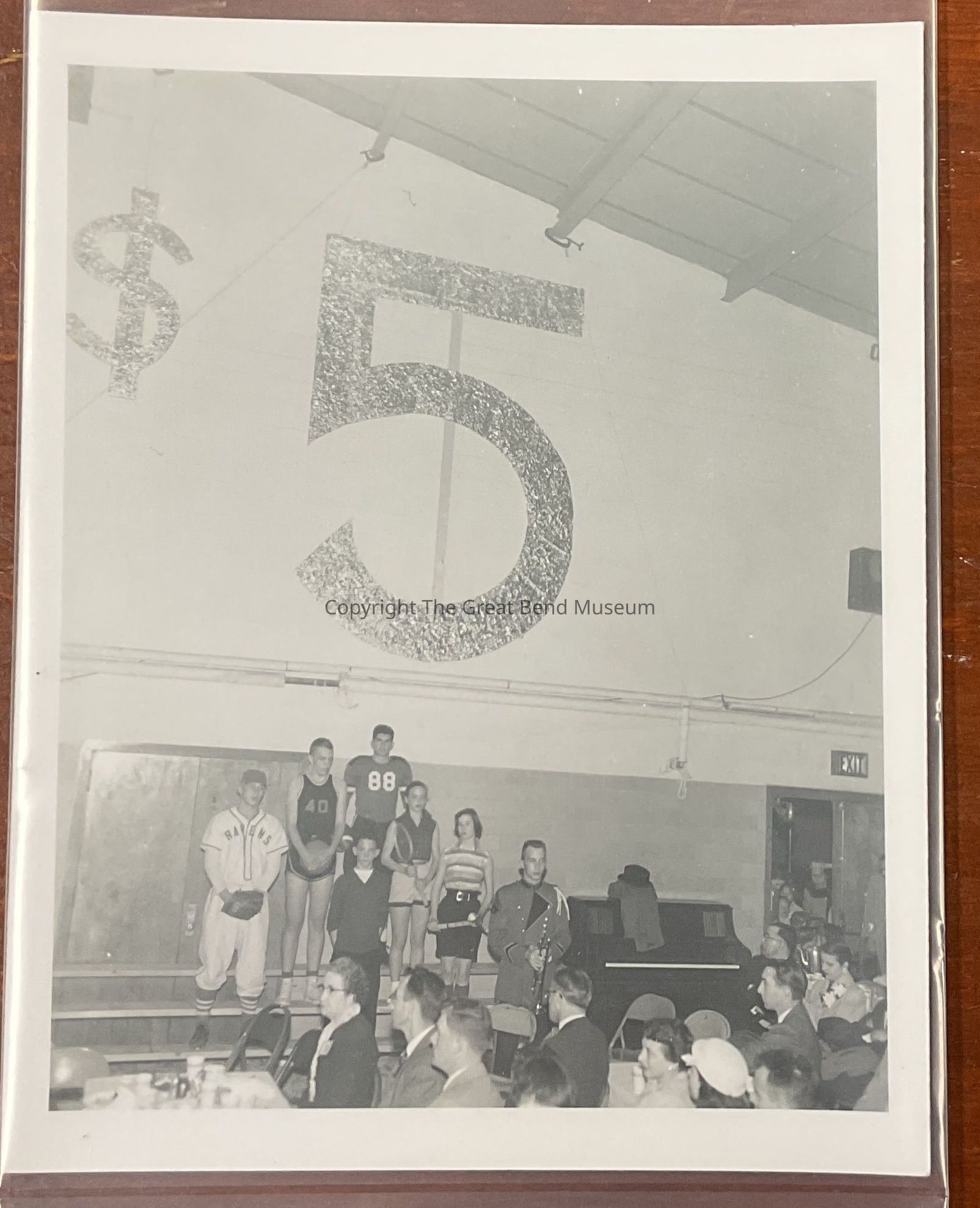 1 large (7-3/4x9-3/4) and 1 small (5.0x4.0) photo High school athletes and musicians standing on bleachers in front of people sitting at dinner tables -- On wall behind them "$5" large sign. I believe this was taken in 19526Acquisition
