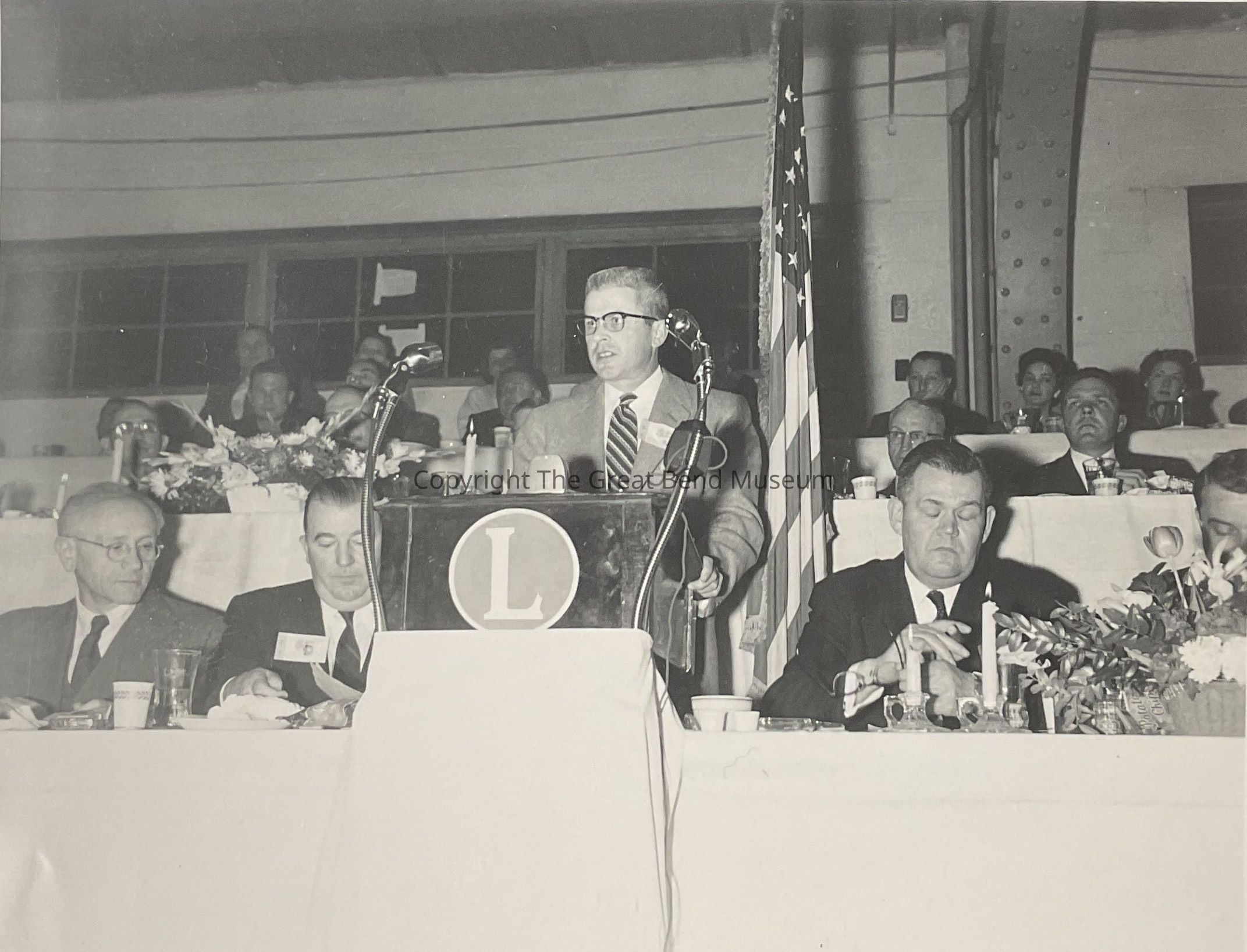 Man speaking at podium - Bob Cole, Walter Purdy to his left; to his right is Jennings Randolph, Philip Sporn. On front of podium is "L", American flag behind speaker, 2-3 tiers of tables/people behind speaker.