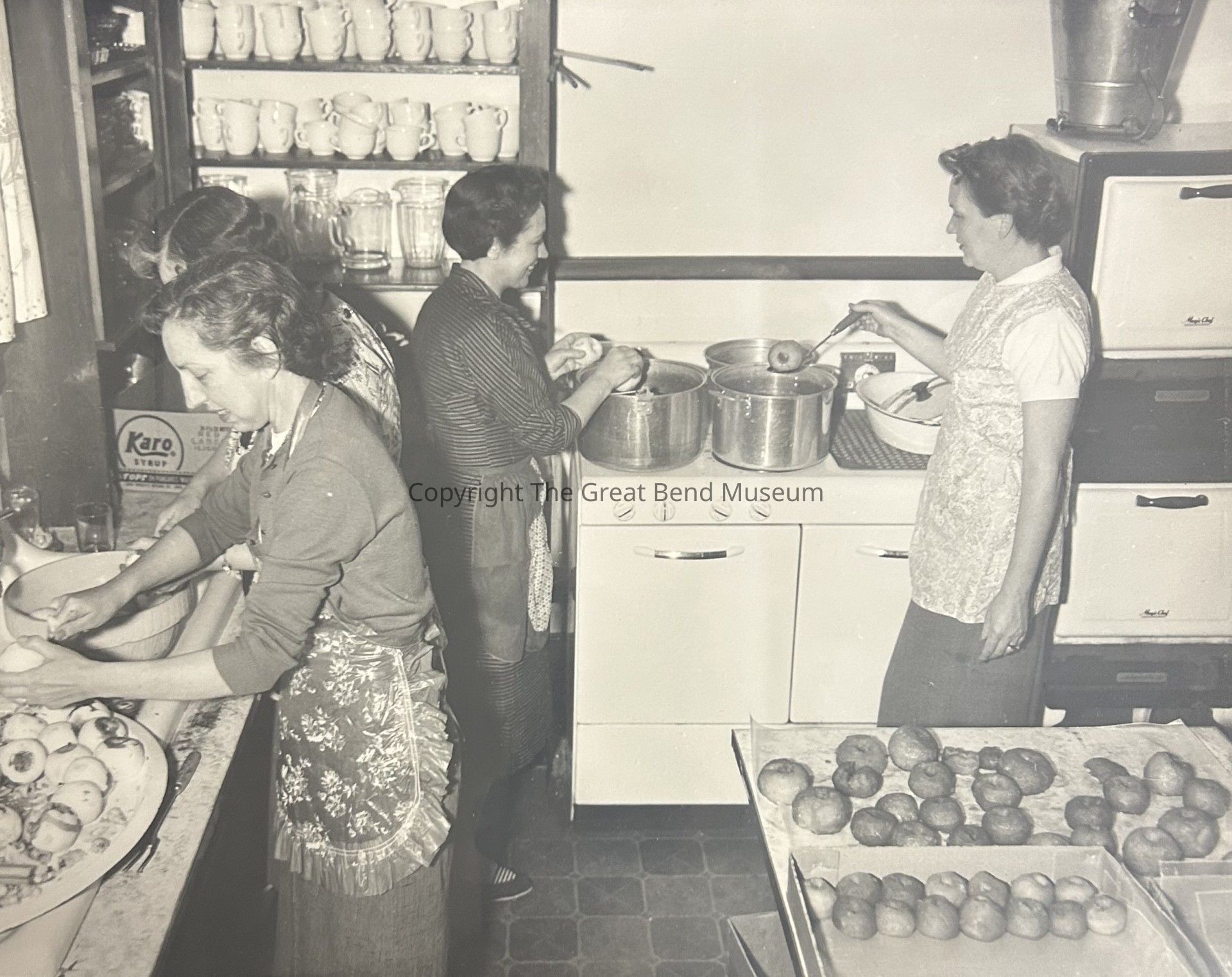 Ladies coring and cooking apples on trays on tables. Cups and pitchers on shelves. Box with "Karo Syrup" on box. $5 Banquet - 1956Acquisition