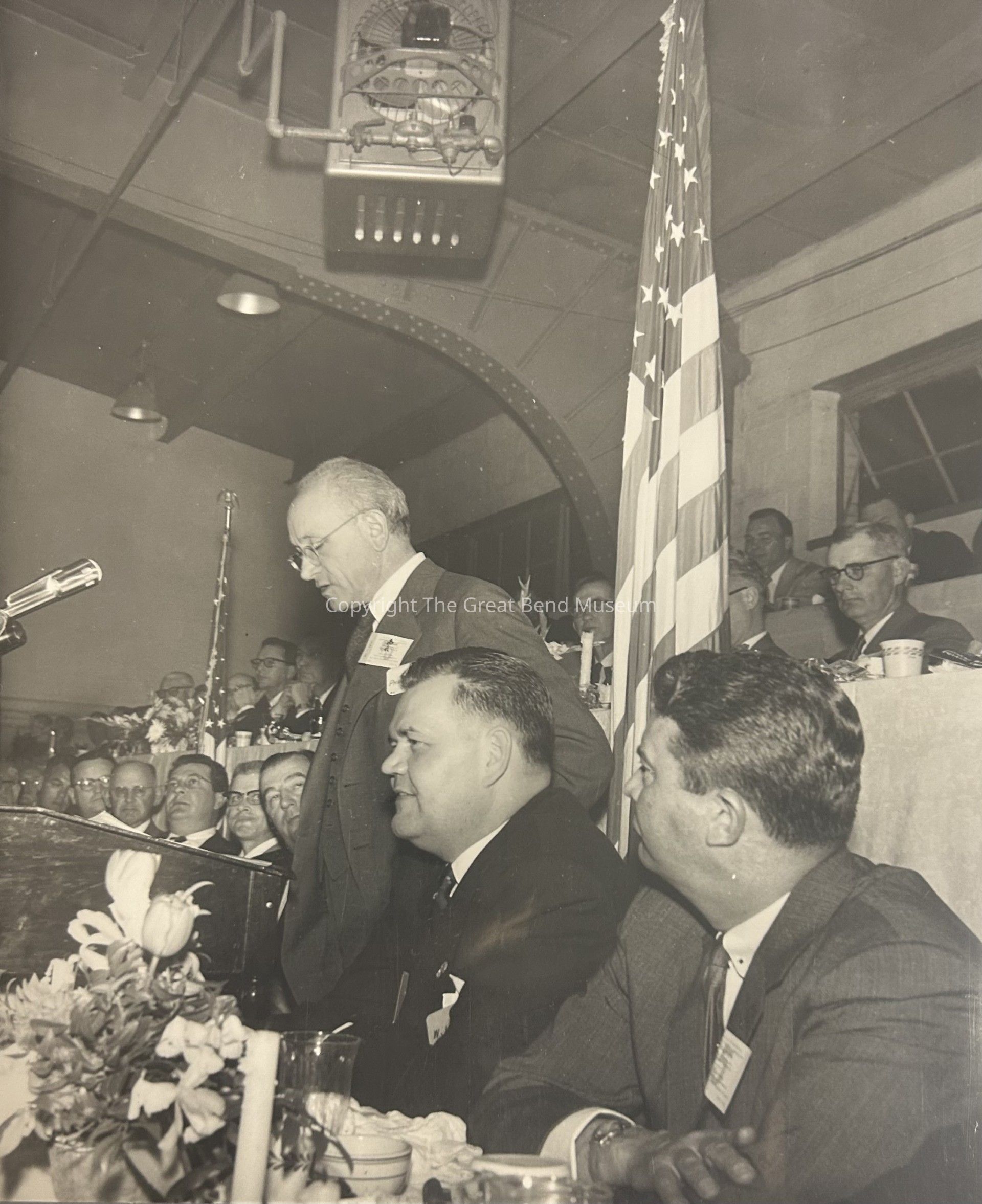 Philip Sporn standing at podium, to his right is Jennings Randolph, to his left is Walter Purdy, Unknown. 2-3 tiers of people behind him and others to his right. American flag behind him.