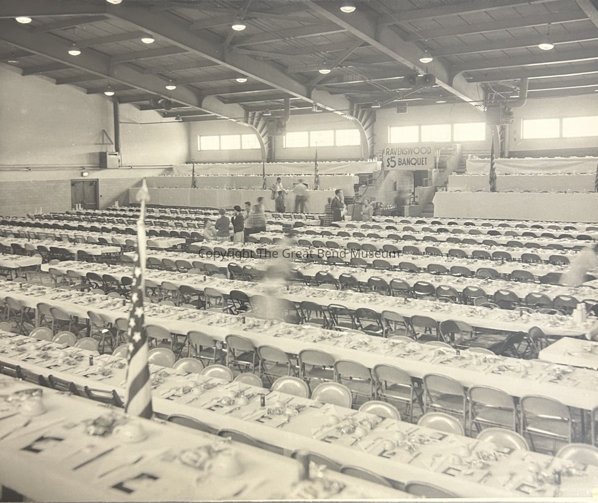 $5 Banquet --- 1956 -- Set up in Ravenswood Gym. A few people setting up. Banner - "Banquet $5 Banquet", American flags in various places.Photograph Details