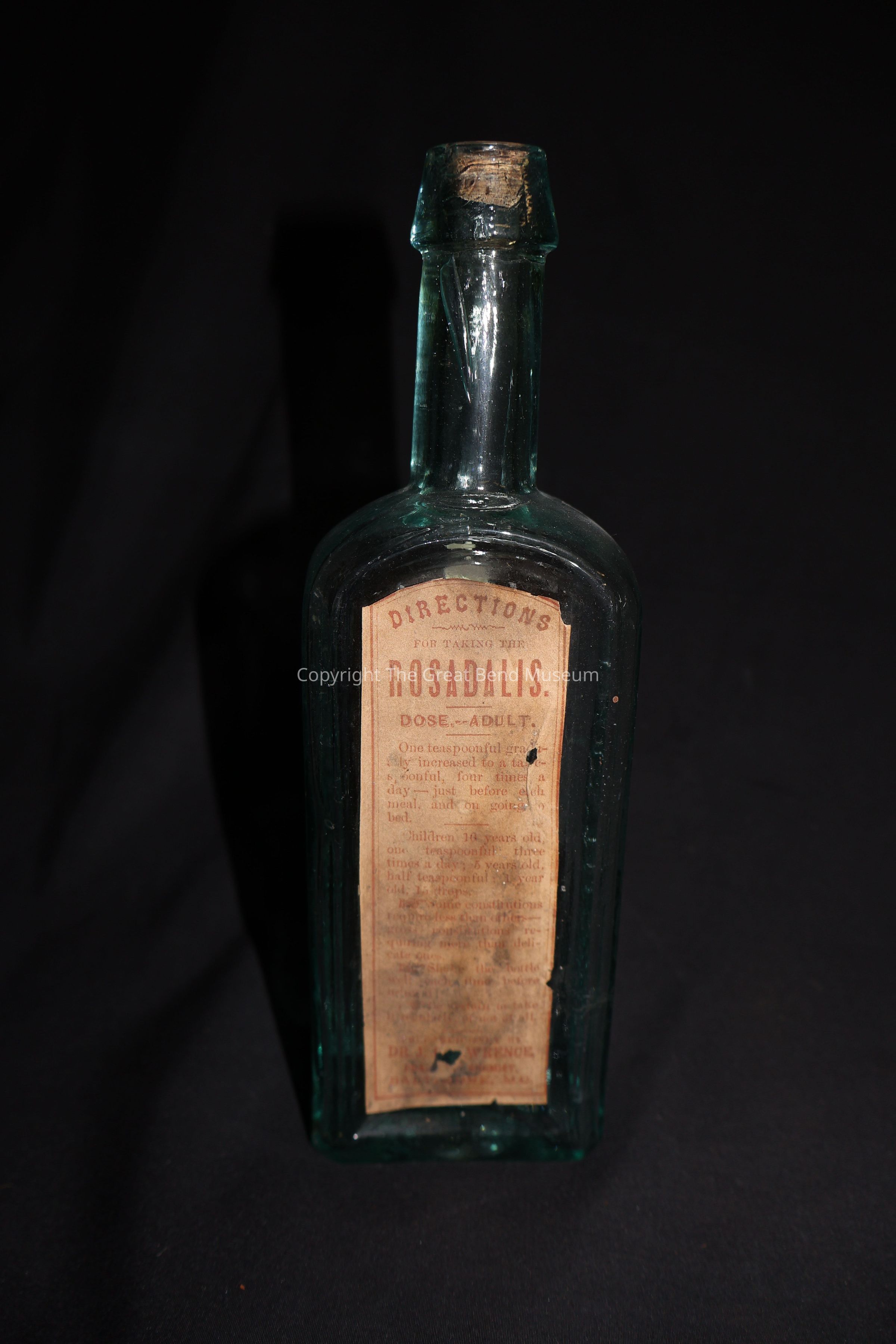 Aqua tinted medicine bottle with "J.J. Lawrence & Co." embossed on the side. With "Baltimore" embossed on the left side of the bottle. Label of contents say "Rosadalis" with dosage and directions on the label. Label was light color with red print. The bottle was made by a "key" mold seams cross the base of the bottle, which dates this bottle. 1850's-1870's. Rosadalis was advertised to "cure" a number of ailments including syphillis, skin diseases, liver disease, blood diseases.