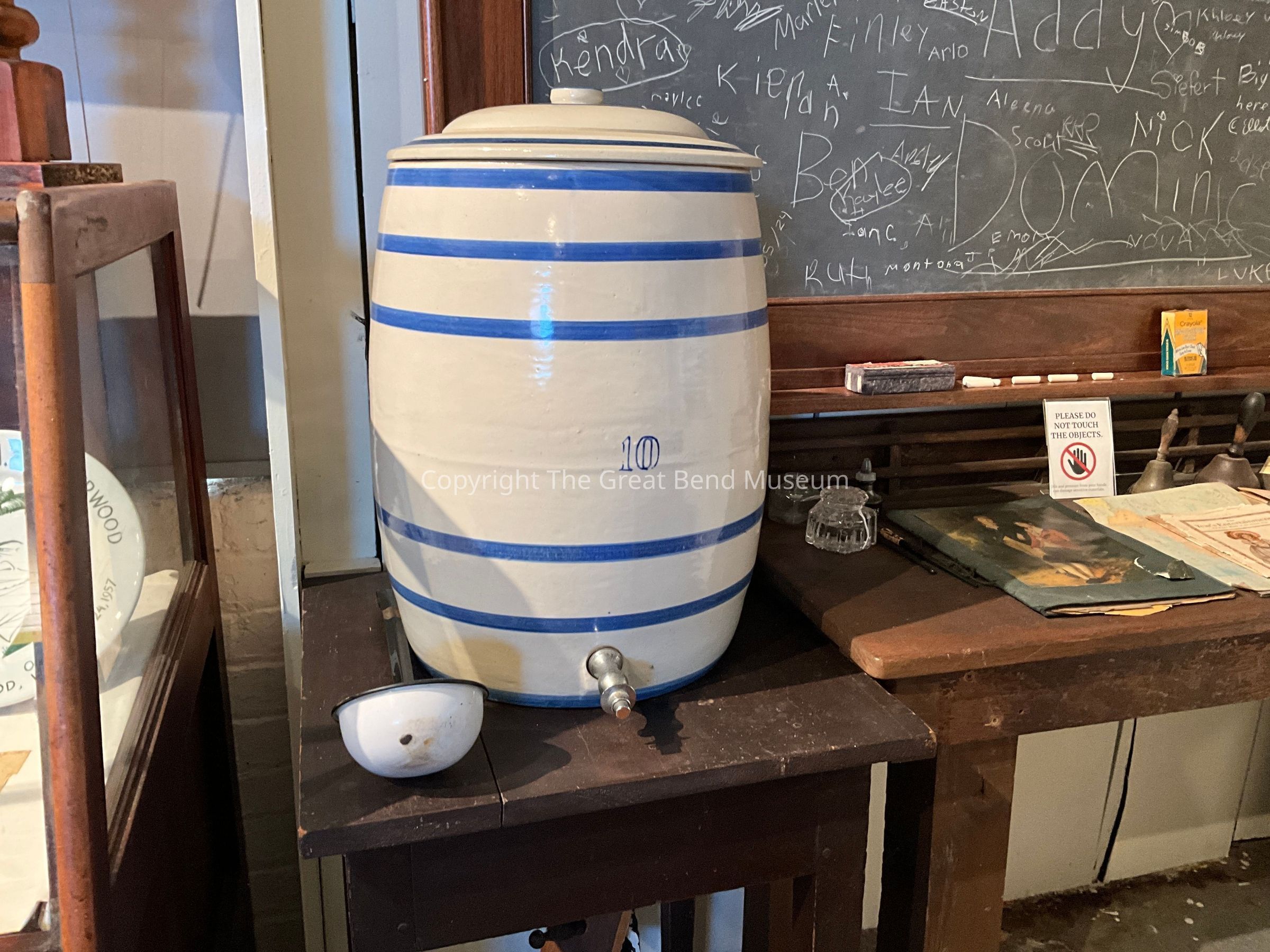 barrel shaped stoneware jug, white/cream with blue strips around. Has metal tap at bottom to dispense water.