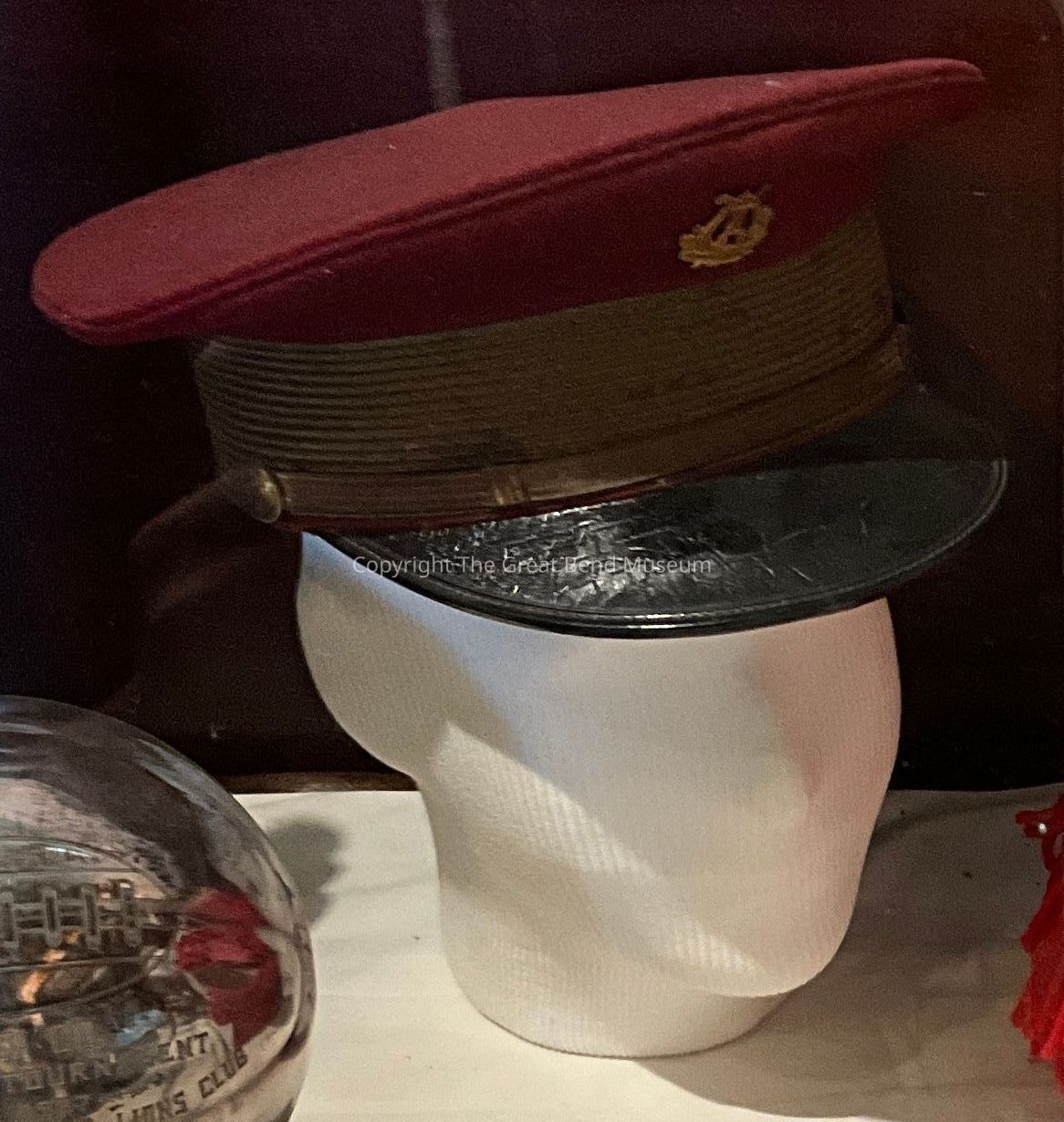 Top is red with gold color cloth band around it, a gold emblem on front of top over band on the red cloth (Flannel/ felt?) a brass button on each side above black brim. Made in Cincinnati, OHAcquisition