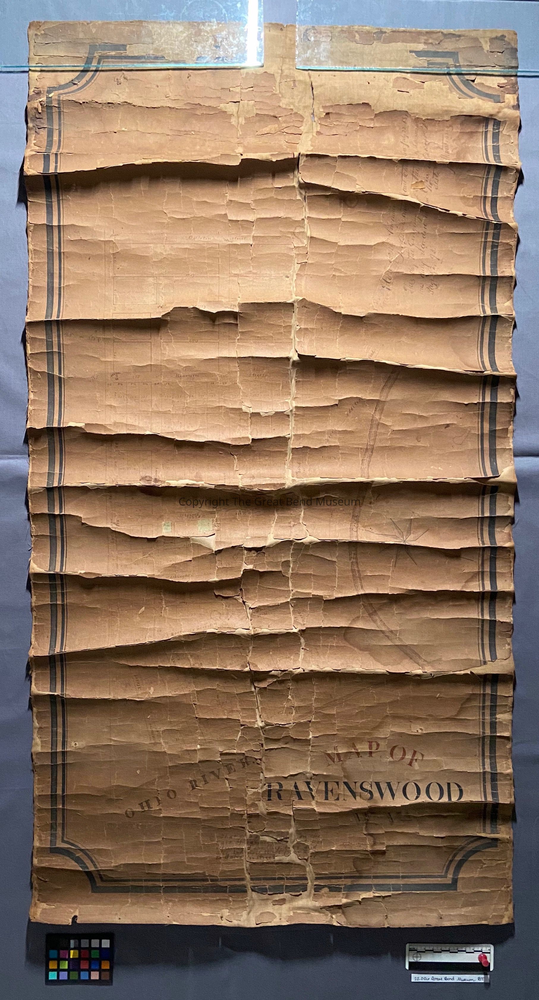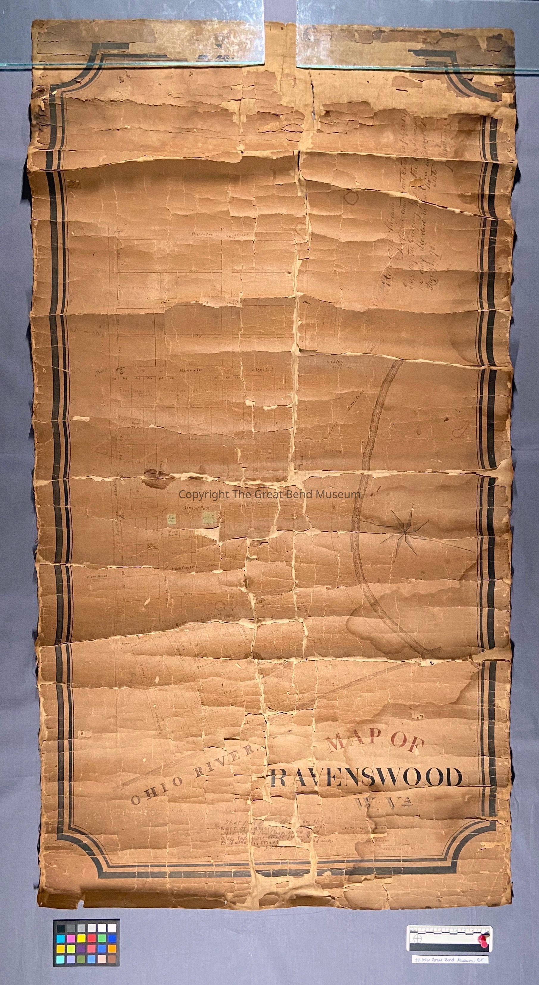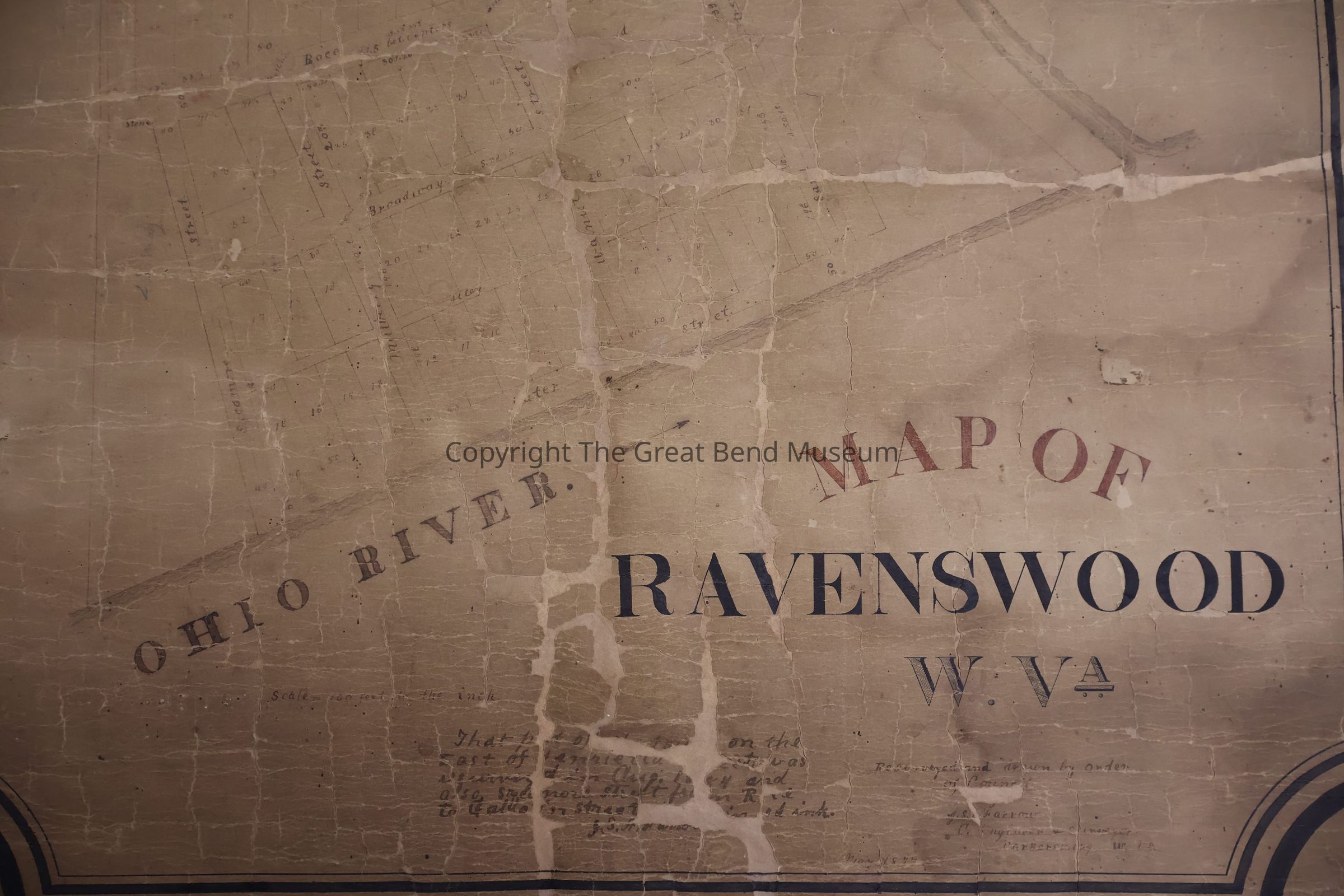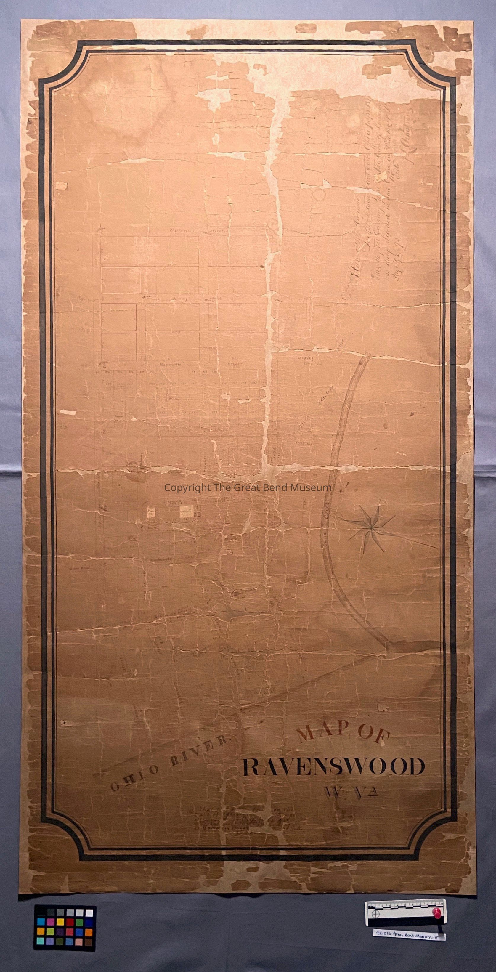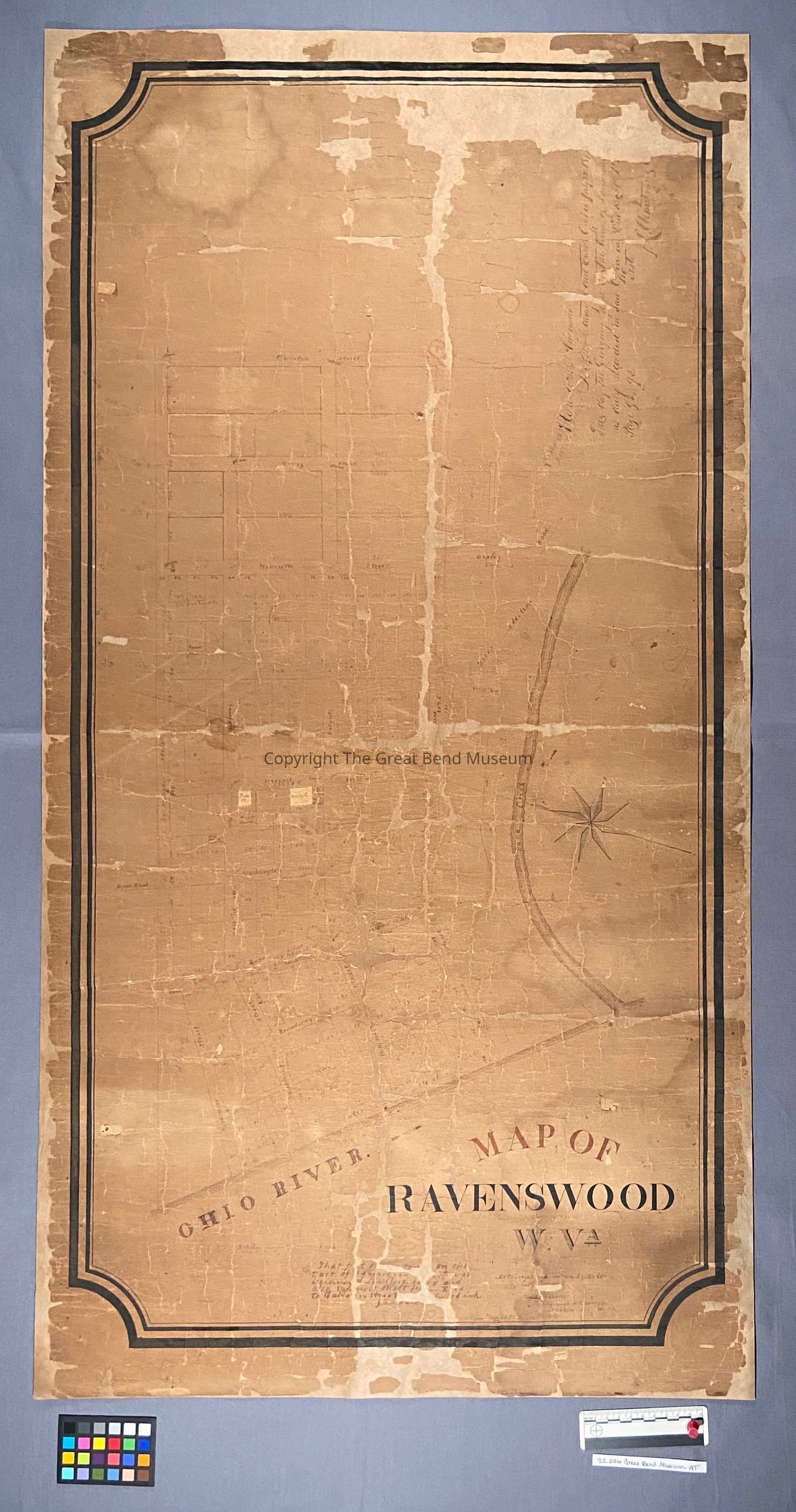 “MAP OF / RAVENSWOOD / W. V.A. / Resurveyed and drawn by order / of Council / J. S. [illegible] Farrow / C. Engineer & Surveyor / Parkersburg, W. V.A. / May 1877”.Material/Technique
