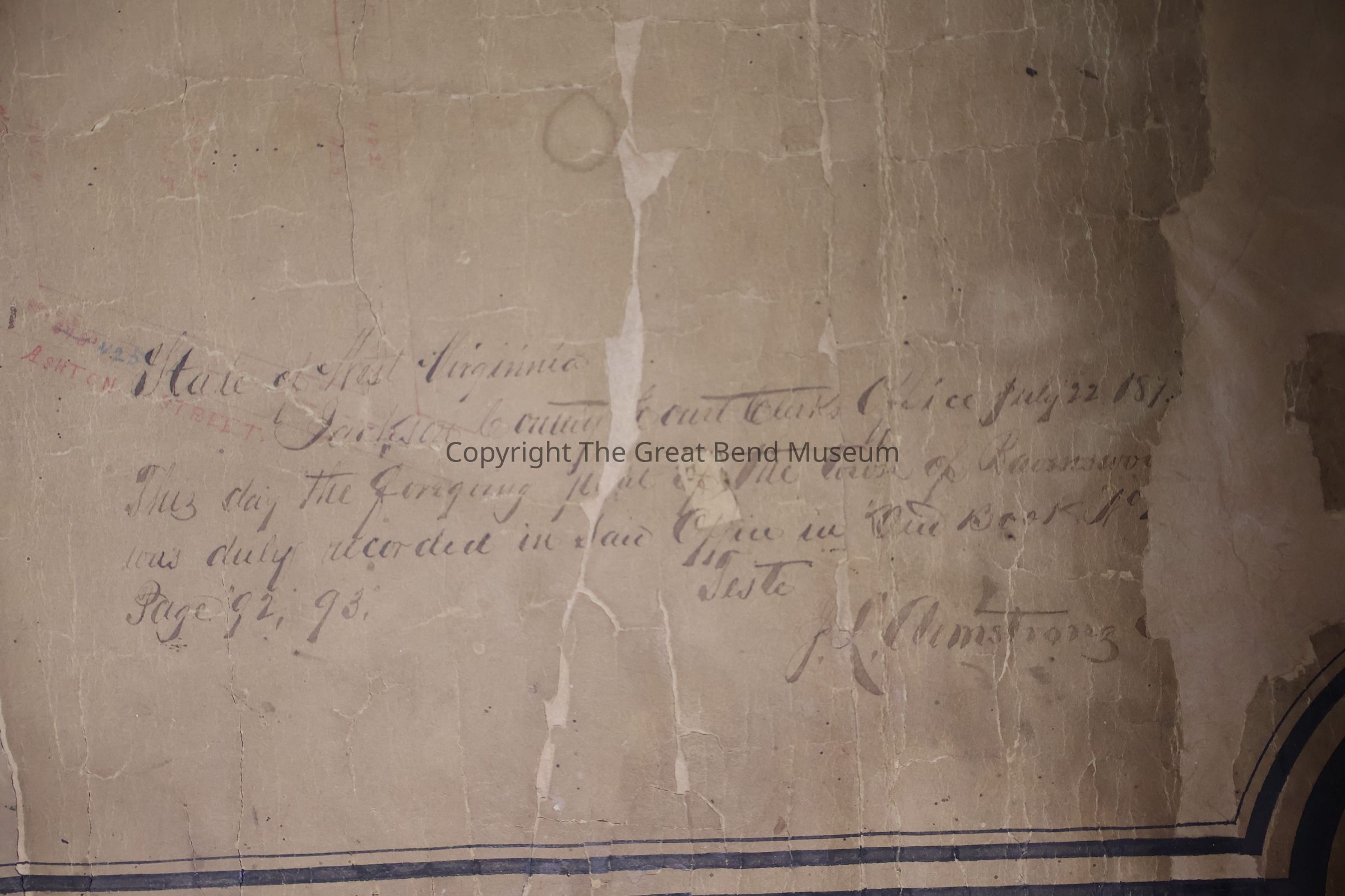 “State of West Virginia / Jackson County Court Clerk’s Office July 22 187[illegible] / This day the foregoing plate of the town of Ravenswood / was duly recorded in Said Office in ‘Deed Book No. [illegible] / Page “92, 93.” / Teste, / J. L. Armstrong [illegible]”.Material/Technique