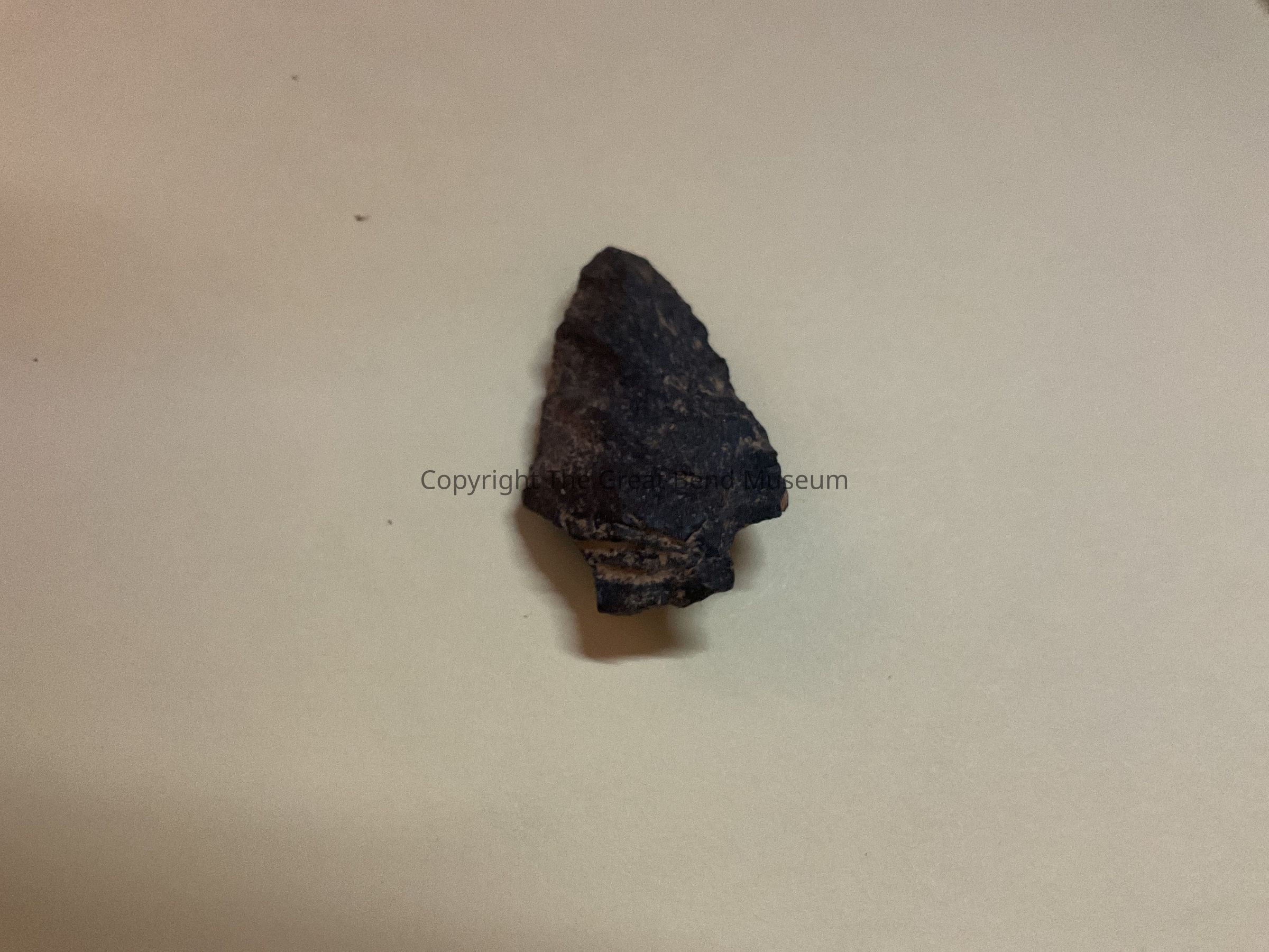 Small dark Gray point, . One shoulder is lower than the other. It has a thick base, stem has squared sides and straight basal edge. Stem. Has been thinned. Sides are serrated from resharpening.Acquisition
