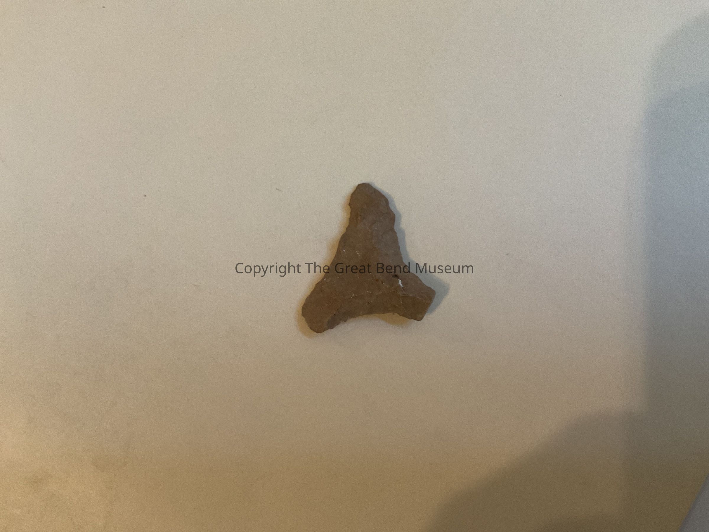 Light Tan triangular shaped point it has a convex base. Basal edge is flared. Triangular shaped with all sides curved in. One side of basal edge is chipped.Acquisition
