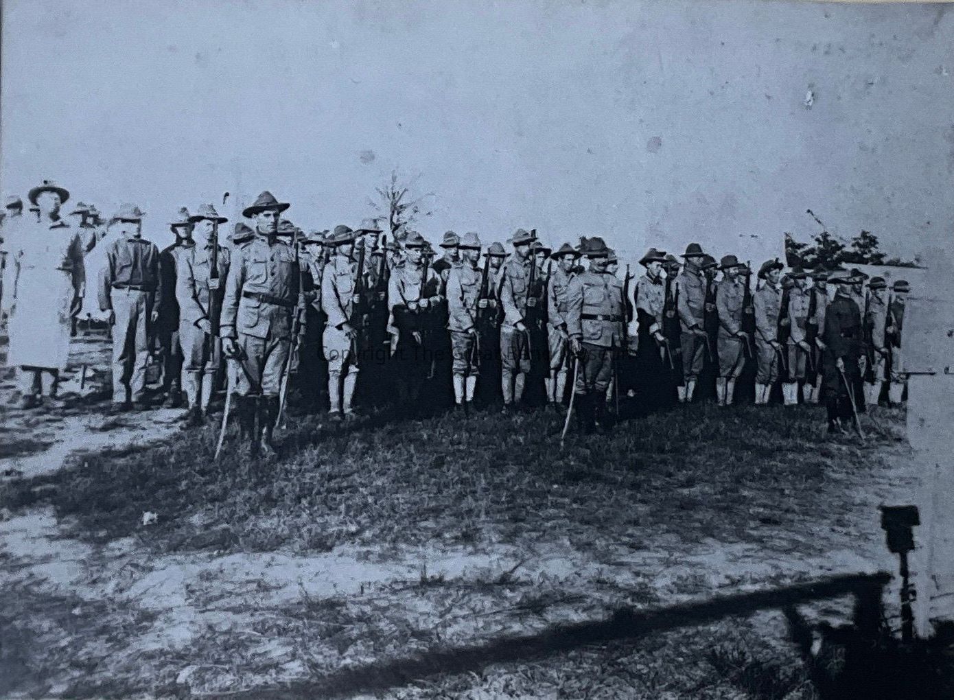 Photo WWI Camp of uniformed men, formation on a grassy knoll near Ravenswood in 1918. All are holding their weapons.Acquisition