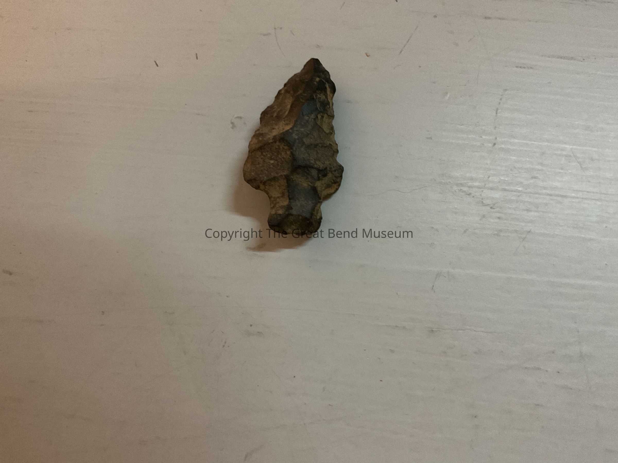 Medium gray with light brown point. Triangular shaped with one side of point angled to the left. Stem is straight with rounded shoulders. Stem is as thick as the blade. Basal edge is straight.Acquisition