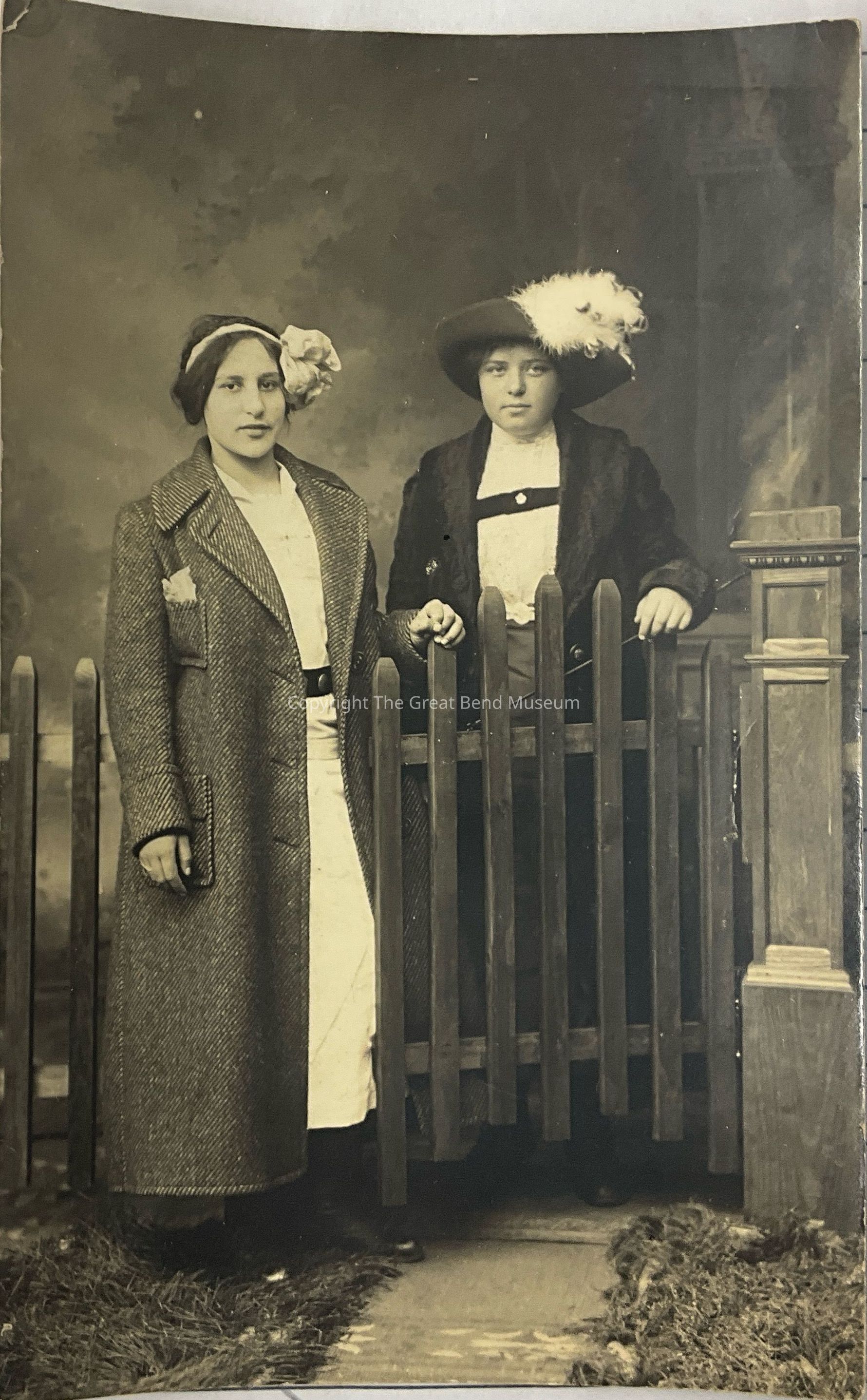 Photo of 2 women standing on a fence (one of them may be Pearl Baillis)