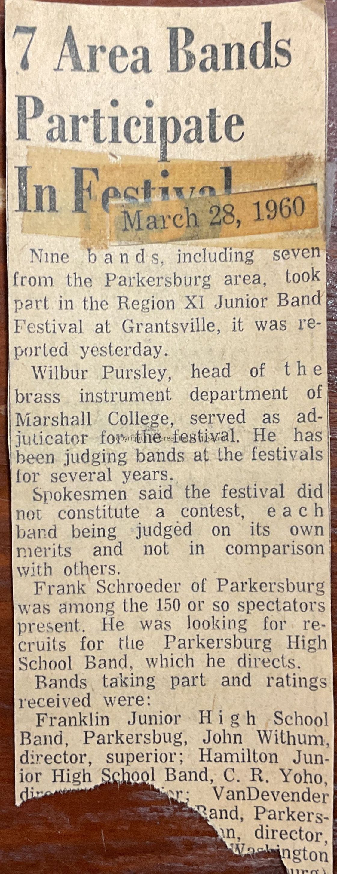 7 Parkersburg area high schools took part in the Region XI Junior Band Festival - March 28, 1960