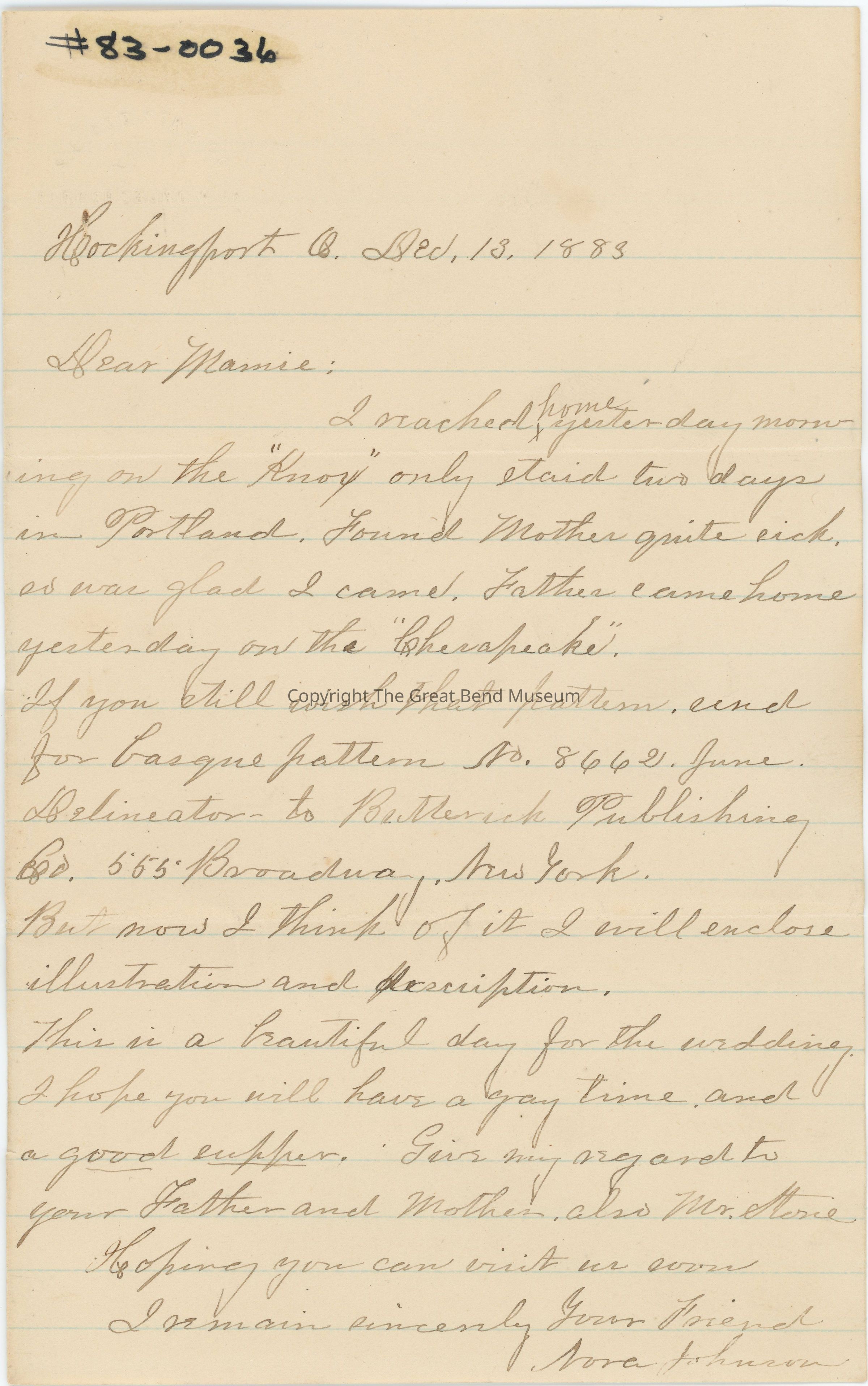 Letter to Mamie Sargent from Nora Johnson of Hocking port Ohio, regarding a dress pattern. 83-0037 is the envelope with this letter it has a red, George Washington 2¢ stamp. Small, addressed to Miss Mamie Sargent, Ravenswood, WV