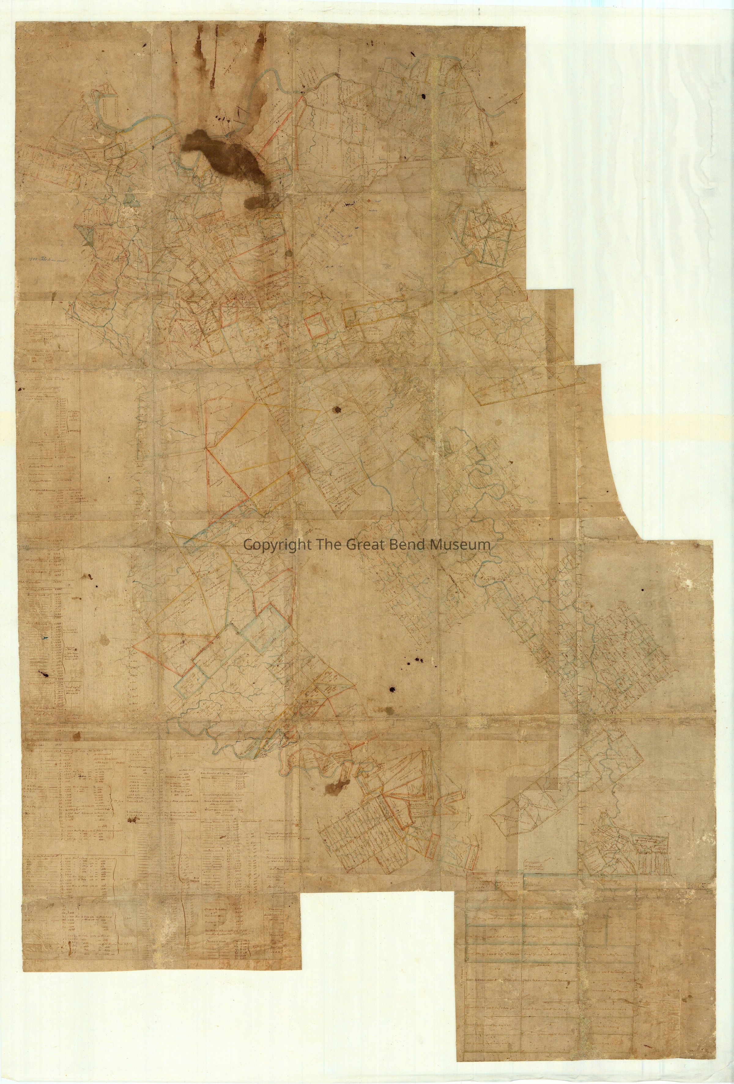 Originally composed of multiple pieces of laid paper, the current outline of the primary paper support is wildly uneven. This may have been the original format of the map, as more land was acquired, surveyed, and added to the already existing map, requiring additions or alterations to the paper support; alternately, a more rectilinear object may have been cut down as the outer, empty areas of paper became damaged. It is likely that the current shape of the primary support may be result of both possibilities - additions and removals - as the assemblage of paper sheets is uneven and areas have fragmentary text, indicating that portions are no longer extant.