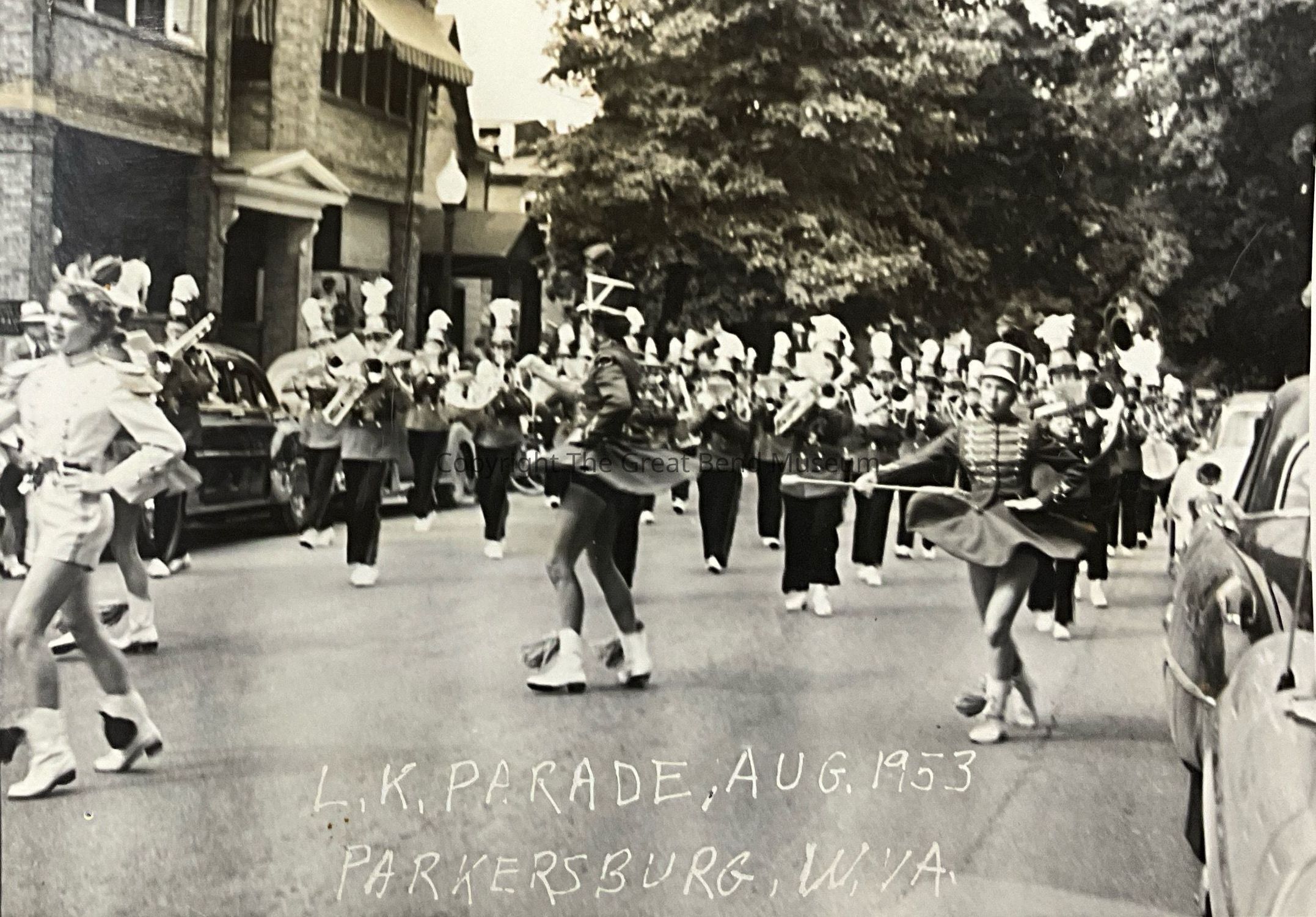 Charlotte Monroe is head majorette at the L.K. Parade, August 1953