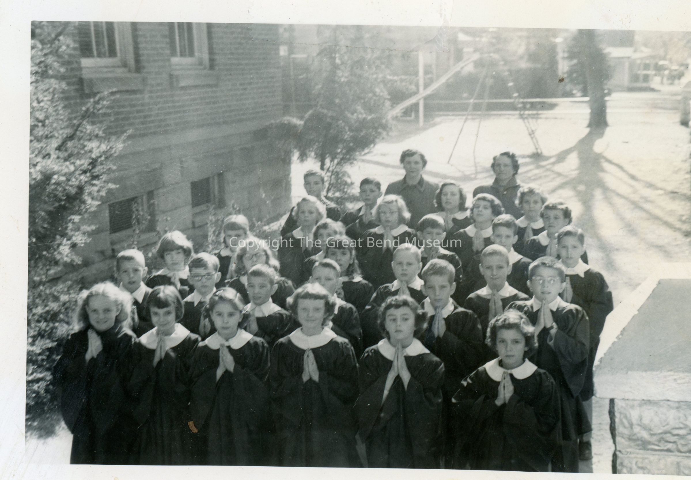 Group of boys and girls - possibly in choir robes - hands folded as if in prayer.